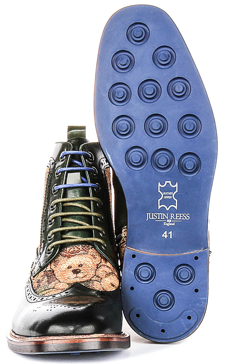 The sole is crafted in a durable blue rubber, offering excellent grip and traction, and is stamped with the Justinreess England logo for a mark of quality. Whether you pair them with tailored trousers or smart-casual denim, the Teddy Hi boots will add personality and refinement to any outfit. Choose Justinreess England for distinctive footwear that blends British heritage with bold design.
