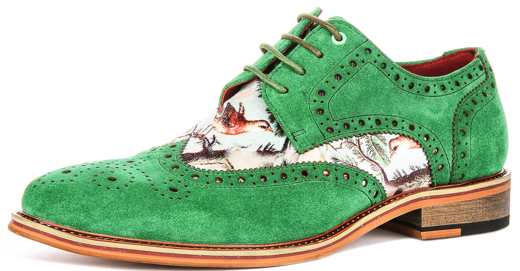 A standout feature of the Wolf model is its distinctive fabric panel on the vamp, adorned with a colourful and artistic nature-inspired print. This creative touch adds personality and sets these shoes apart from standard formal footwear, making them perfect for those who wish to express individuality while maintaining sophistication.
