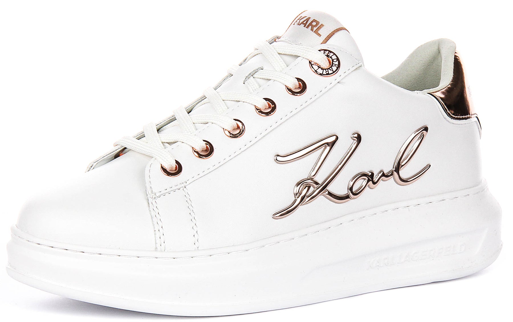 Karl Lagerfeld Kapri Signia Lc womens leather trainers bring signature flair to an everyday essential. Crafted from smooth leather in crisp white, they’re elevated with metallic rose-gold details for a modern, luxe finish that stands out without shouting.