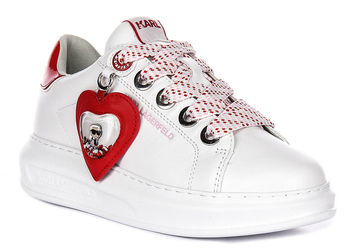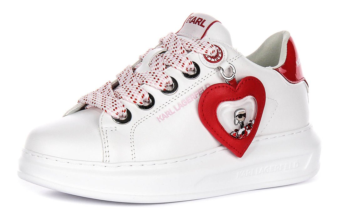 One of the standout features of the Kapri Valentine trainers is the bold heart-shaped accessory in vibrant red leather attached to the side. Within the heart is a charming emblem of Karl Lagerfeld’s iconic silhouette, adding a creative and playful twist to the design. This eye-catching detail complements the bright pops of red throughout the shoe, including on the glossy heel tab, which is embossed with the Karl Lagerfeld logo.