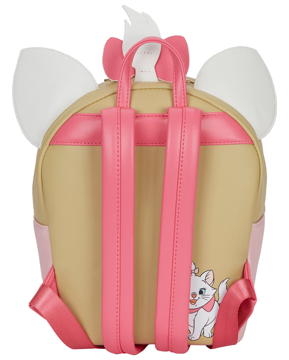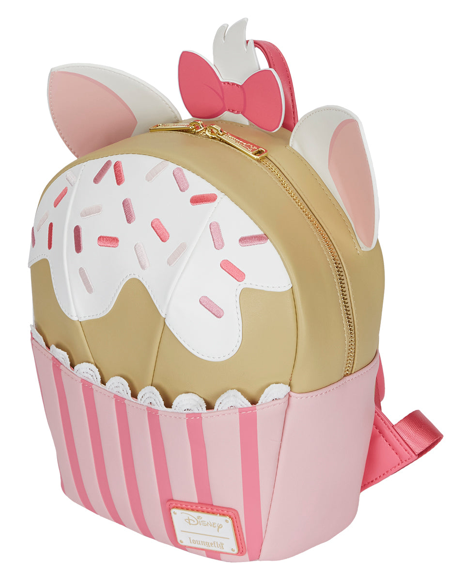 The exterior showcases a striking combination of pastel pink, cream, and tan shades, perfectly complemented by adorable 3D cat ears, a sculpted pink bow, and appliqué sprinkles to mimic a sweet cupcake. The front of the bag features an enchanting image of Marie, instantly recognisable and guaranteed to bring a smile to your face. The pink-and-white striped base adds a fun, patisserie-inspired touch, while the gold-tone zip fastening offers both style and security.