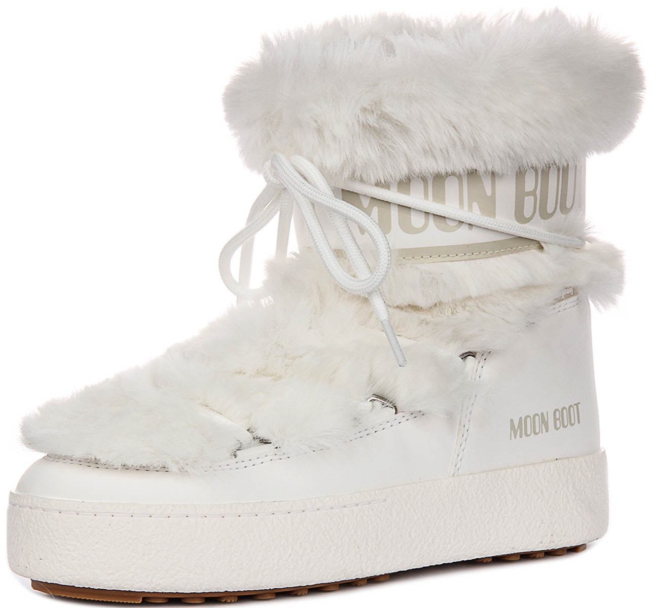 Moon Boot Ltrack Low Fur In White For Women Puffy Nylon Waterproof Faux Fur Boot