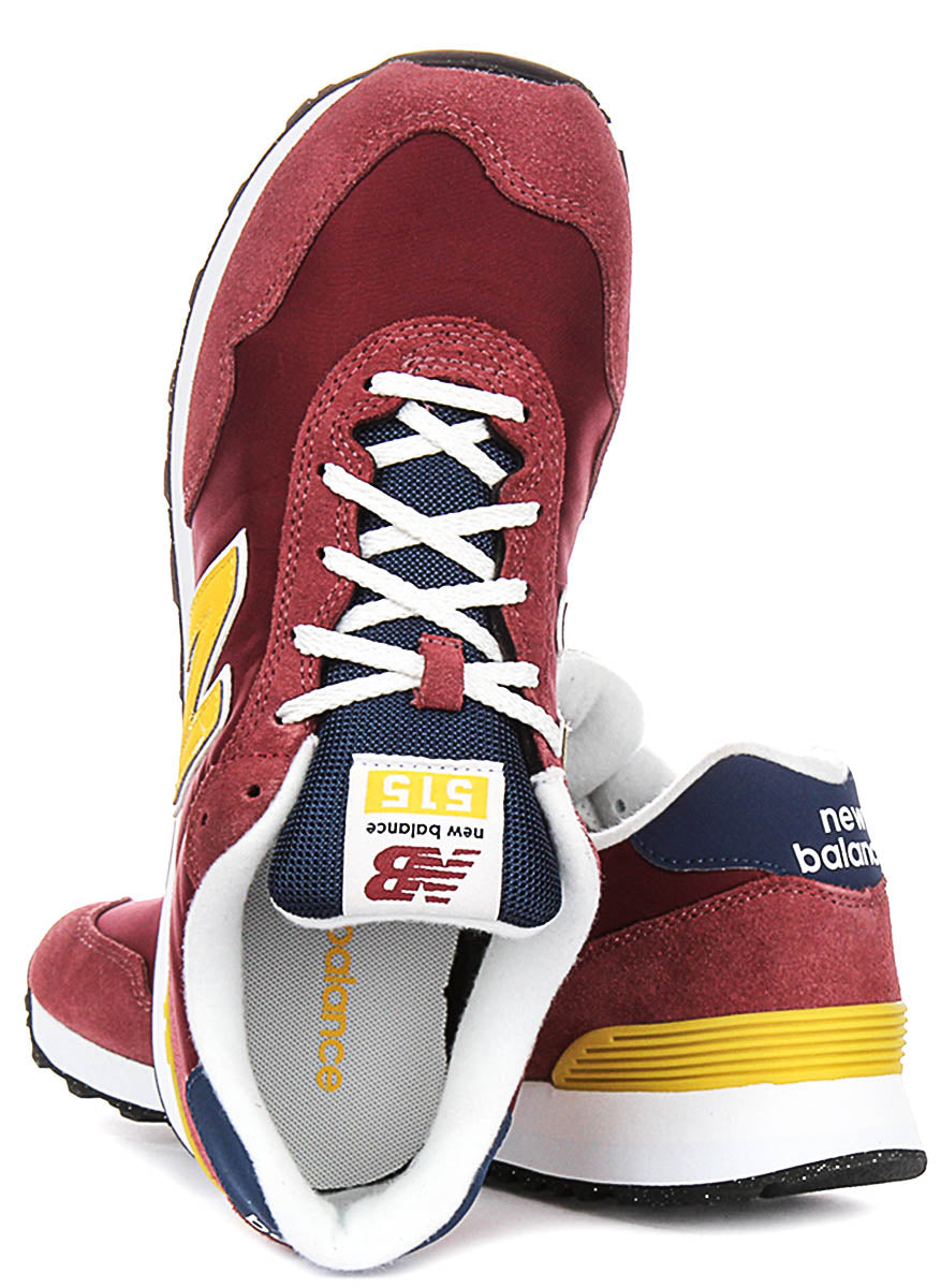 Distinctive New Balance branding is showcased throughout the design. A vibrant yellow 'N' logo, outlined crisply in white, stands out on both sides of the shoe, affirming its iconic heritage. The padded collar features a contrasting navy blue overlay at the heel, proudly displaying 'new balance' lettering in white. The tongue, also crafted from navy blue mesh, features a prominent white label with the 'New Balance 515' designation in bold yellow and red.