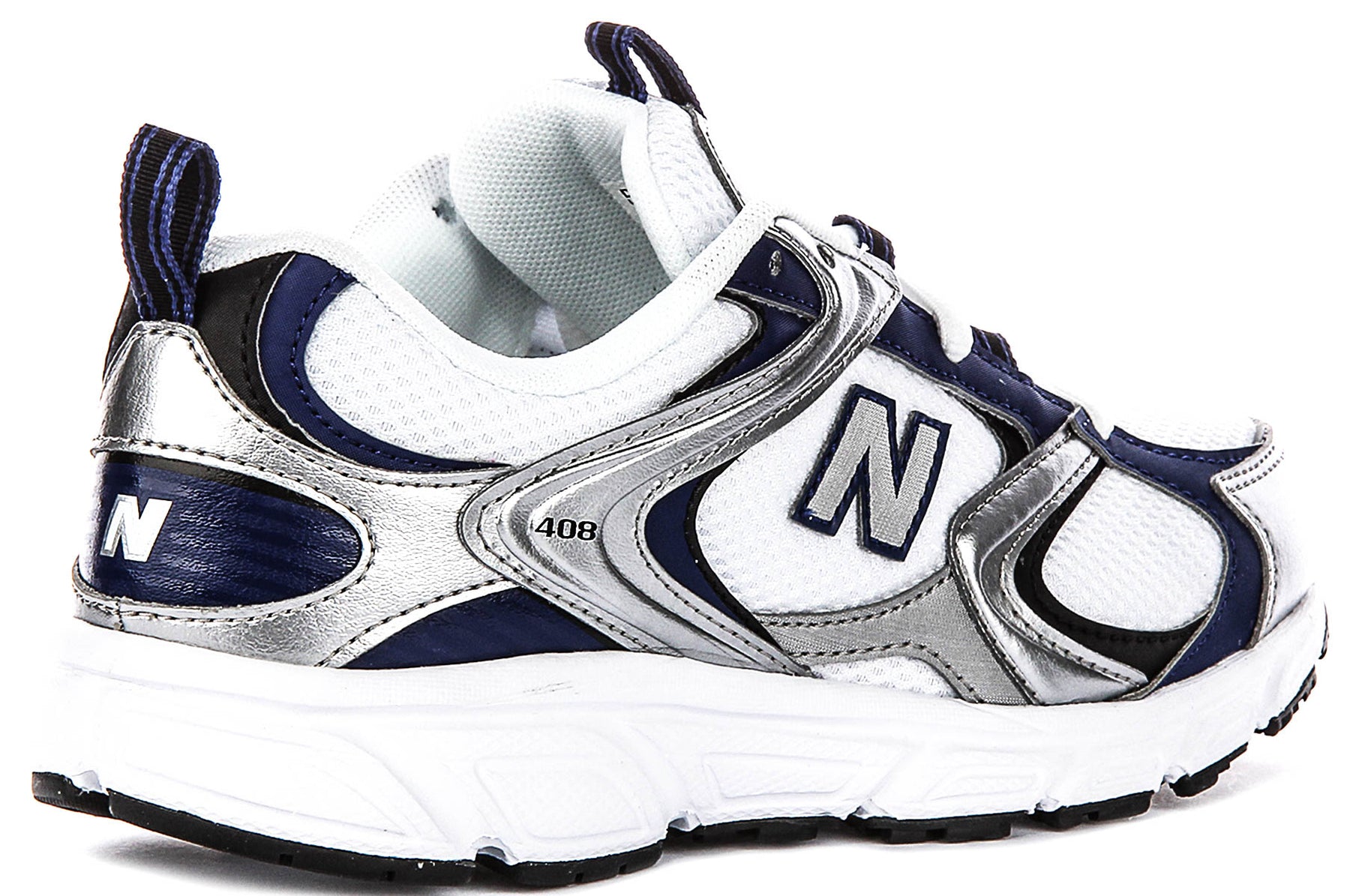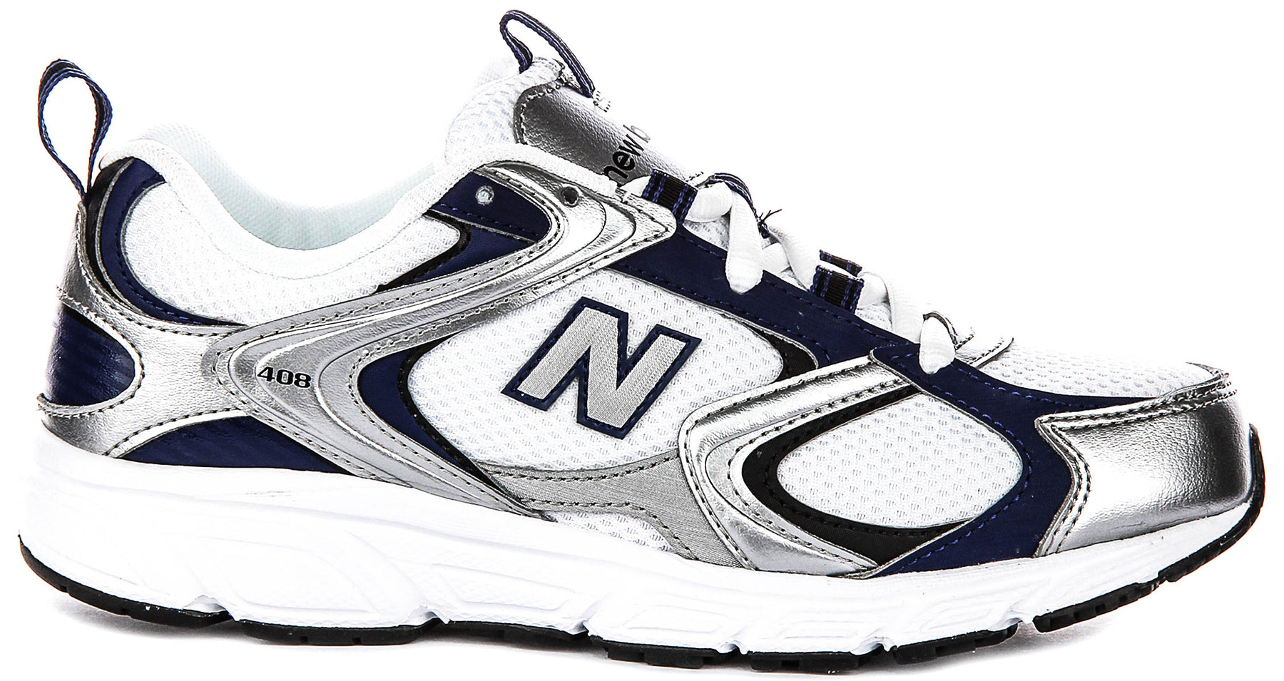 The shoe's structural design showcases New Balance's engineering expertise, with the distinctive "N" logo prominently displayed on the lateral side in grey. The model number 408 is visible on the heel counter, indicating this is part of New Balance's established running and training line. The midfoot features curved support panels that provide stability and a secure fit, whilst the rounded toe box offers ample room for natural foot movement. The heel pull tab, finished in navy blue with white stitching, facilitates easy on and off.