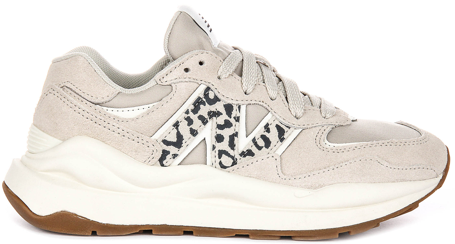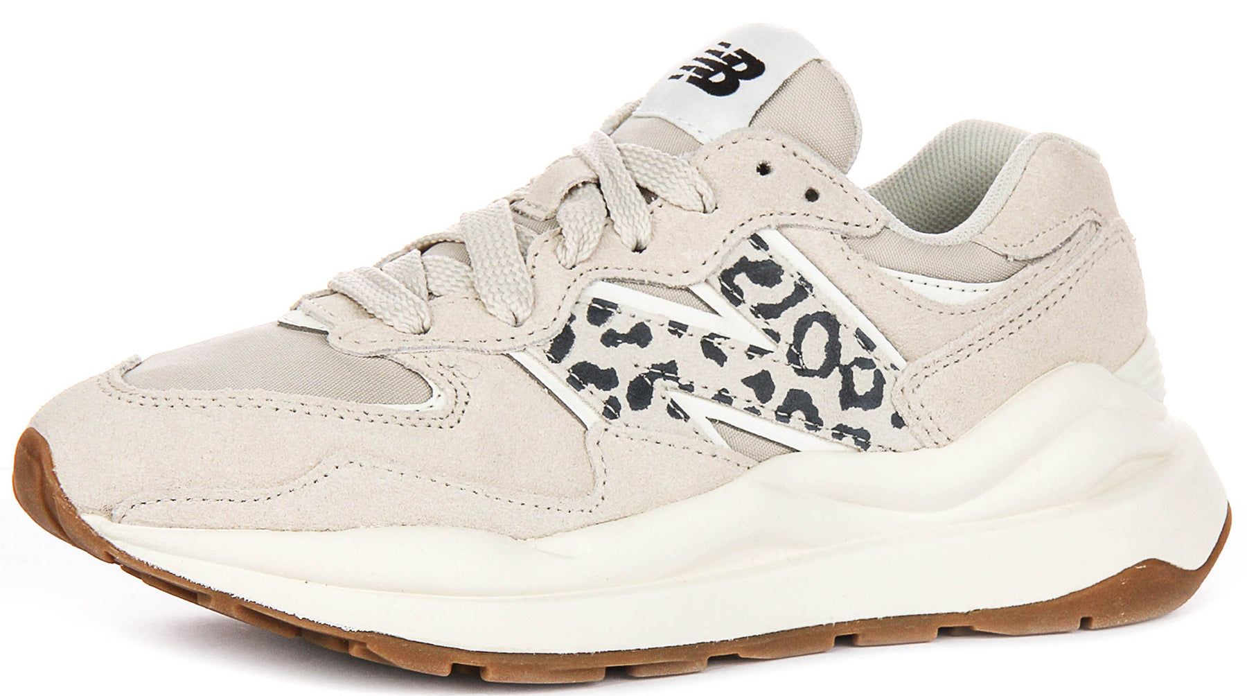 Crafted with a premium suede and breathable mesh upper, these trainers offer both durability and ventilation, ensuring your feet stay comfortable throughout the day. The soft suede overlays are meticulously placed, complementing the airy mesh underlays for a dynamic texture contrast. A striking feature is the iconic New Balance "N" logo on the side, which is boldly presented with an eye-catching black and white leopard print pattern, adding a wild yet refined touch to the neutral design. The traditional lace-up closure features flat laces that seamlessly blend with the trainer's overall palette, while the New Balance brand mark is proudly displayed on the tongue.
