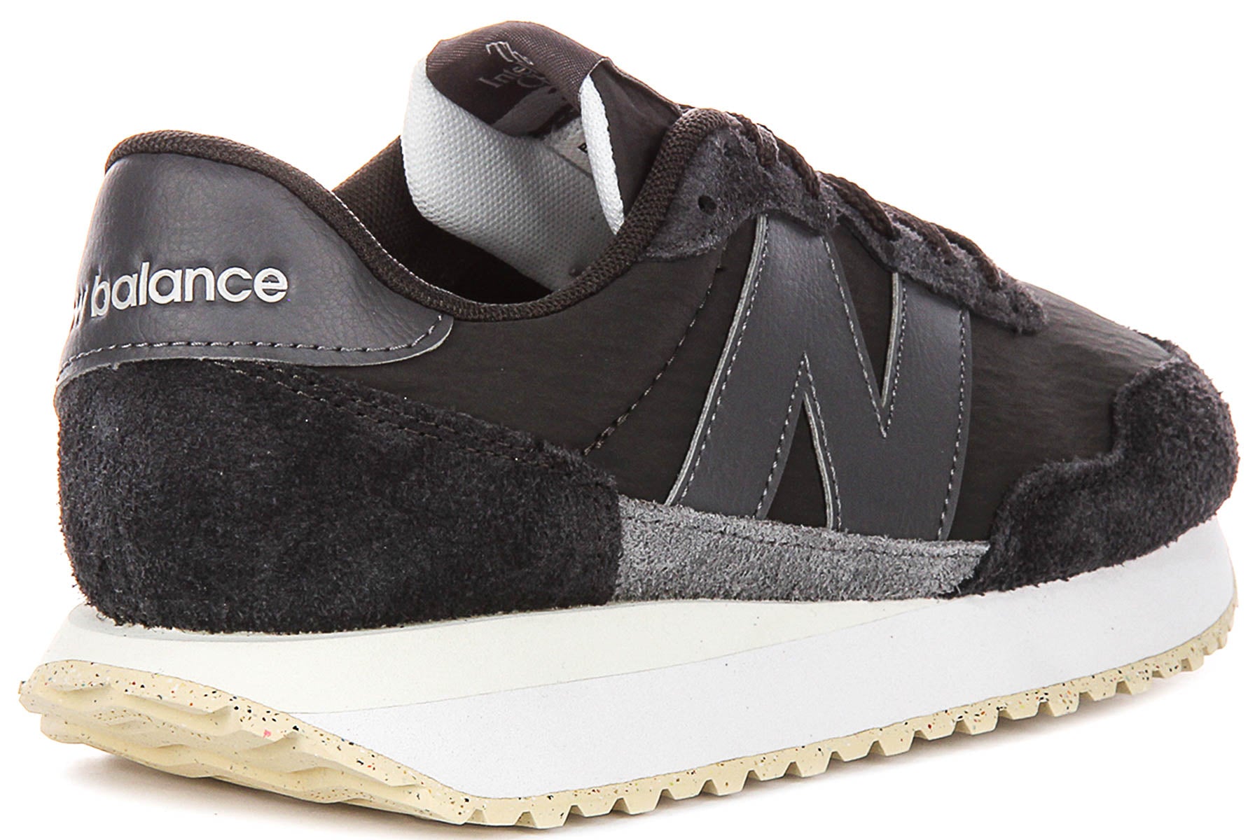 New Balance branding is thoughtfully integrated throughout the design, affirming the authenticity and quality of the footwear. You will find the classic "new balance" script debossed in white on the black synthetic heel tab, the iconic flying New Balance logo on the tongue label, and further branding along with the model number "237" on the insole.