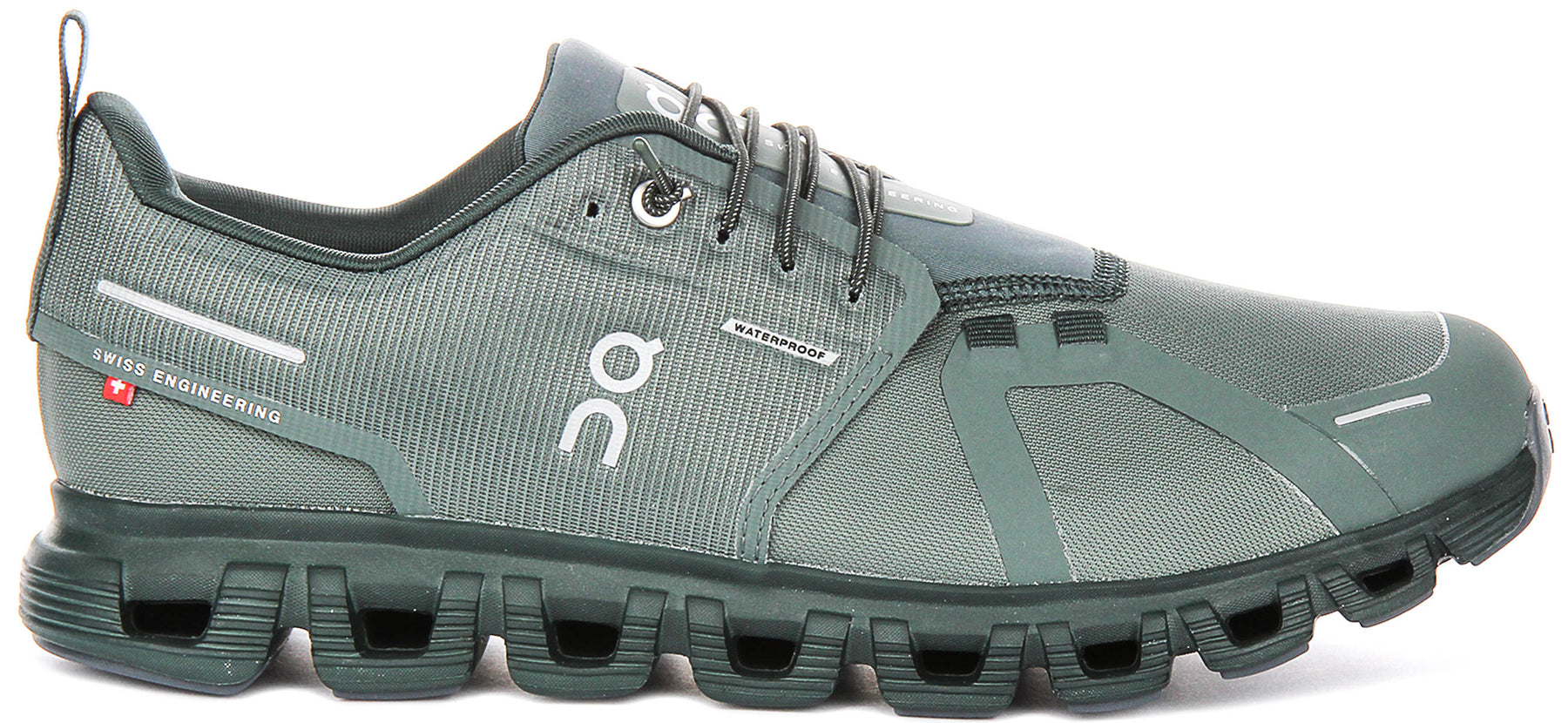 Constructed with a robust yet breathable mesh outer material, these trainers offer optimal ventilation while maintaining resilience against the elements. The sleek, dark forest green hue provides a versatile and understated aesthetic, complemented by strategic synthetic overlays that enhance durability and support across the foot. Emblazoned with the iconic On Running logo and "Swiss Engineering" detailing, these trainers are a testament to superior craftsmanship and innovative design.