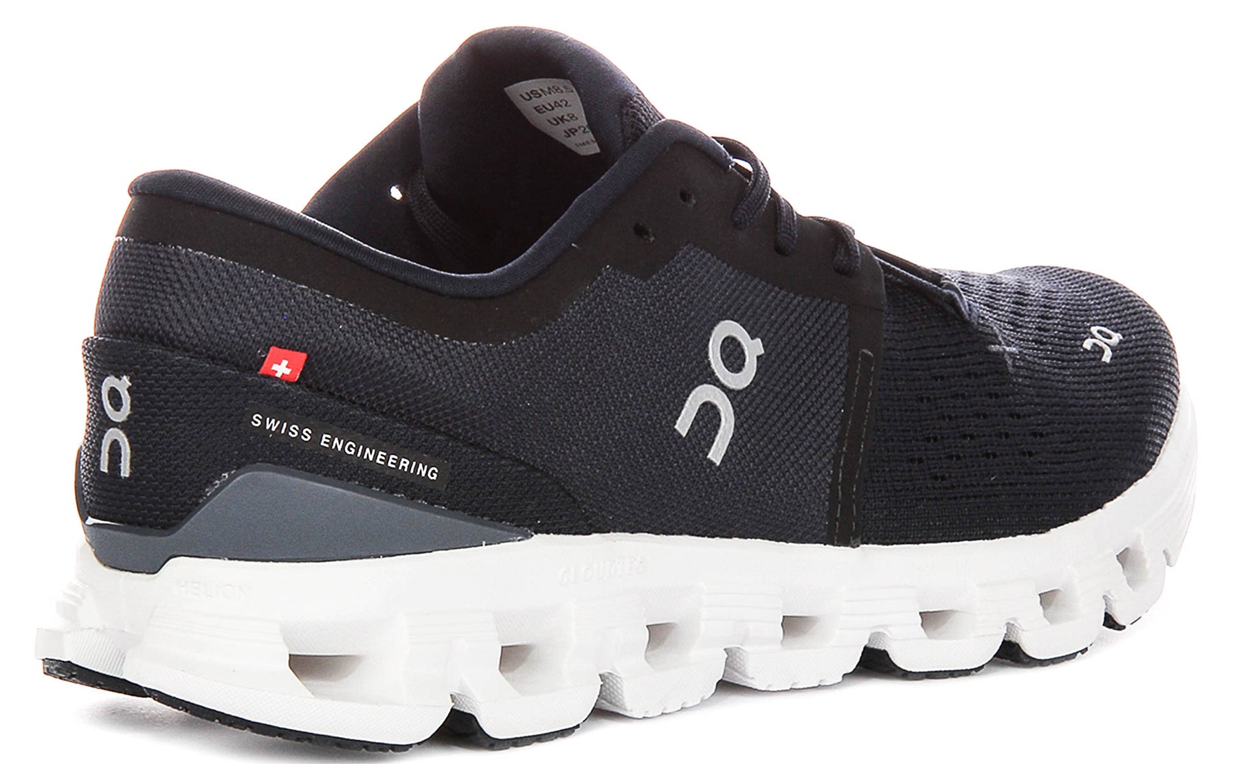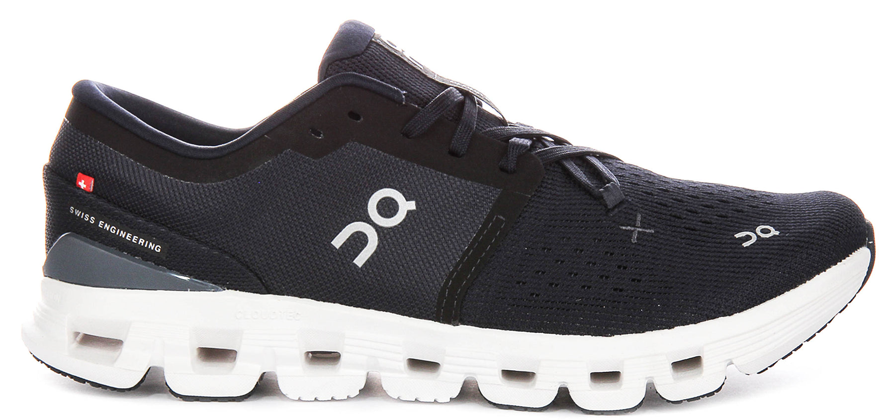 Attention to detail is evident throughout the Cloud X 4. The iconic On Running 'OC' logo is prominently displayed in white on the sides, tongue, and heel, while 'Cloud X' branding can be found on the tongue and inner sole. A subtle yet distinctive Swiss flag and 'Swiss Engineering' text adorn the heel, underscoring the brand's heritage of precision and innovation. The traditional lace-up closure ensures a secure and adjustable fit.