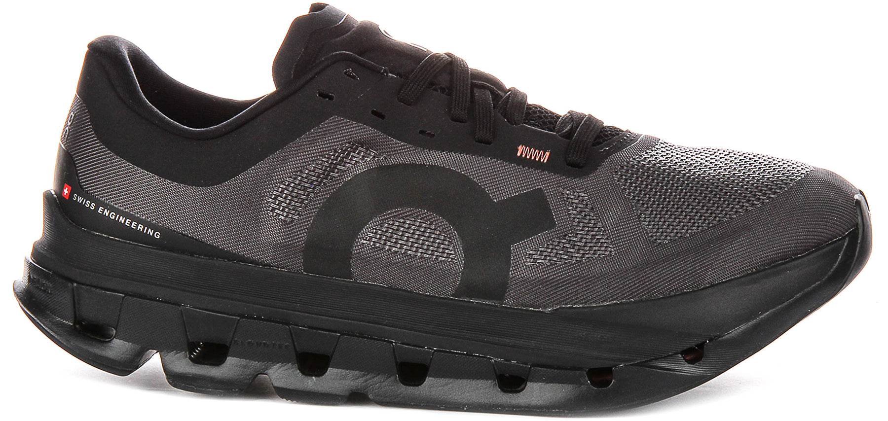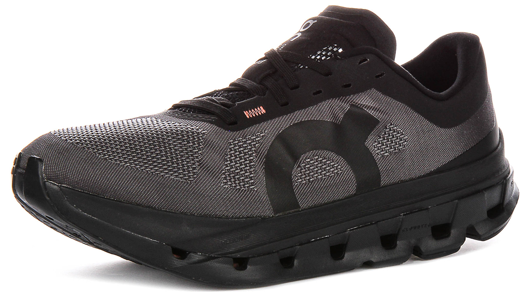 The upper of these Cloudflow 5 trainers features an advanced mesh material, presented in a sophisticated black and dark grey colour scheme. This innovative mesh construction ensures exceptional breathability, keeping your feet cool and comfortable even during intense workouts. The sleek design is complemented by the distinctive On Running logo seamlessly integrated onto the sides, adding a touch of understated style. A secure lace-up fastening provides a snug and adaptive fit, while subtle red accents, such as a zig-zag stitch near the laces and a hint of colour on the inner lining, add a flash of dynamic contrast to the otherwise monochrome palette.