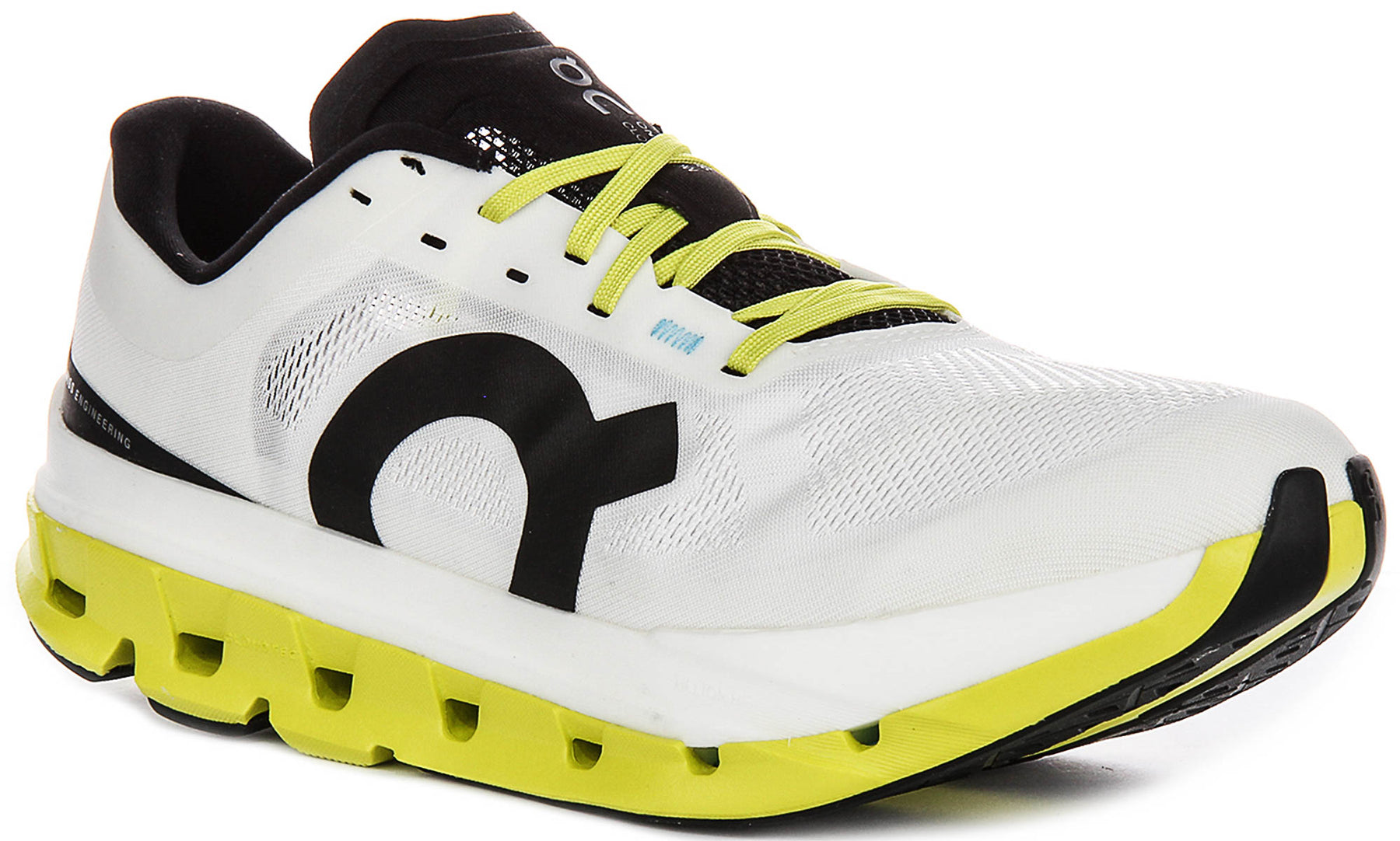 At the heart of the Cloudflow 5's performance lies its advanced sole technology. The distinctive CloudTec sole, visible in the vibrant lime green, incorporates individual 'clouds' that compress upon impact to deliver superb cushioning, then spring back to provide explosive energy return. This is combined with On Running's Helion superfoam, ensuring a soft landing and powerful take-off. Furthermore, the integrated Speedboard, visible as a light blue strip on the outsole, enhances propulsion, driving you forward with every step. The durable outsole features a multi-directional grip pattern, primarily in black, offering reliable traction across various surfaces.