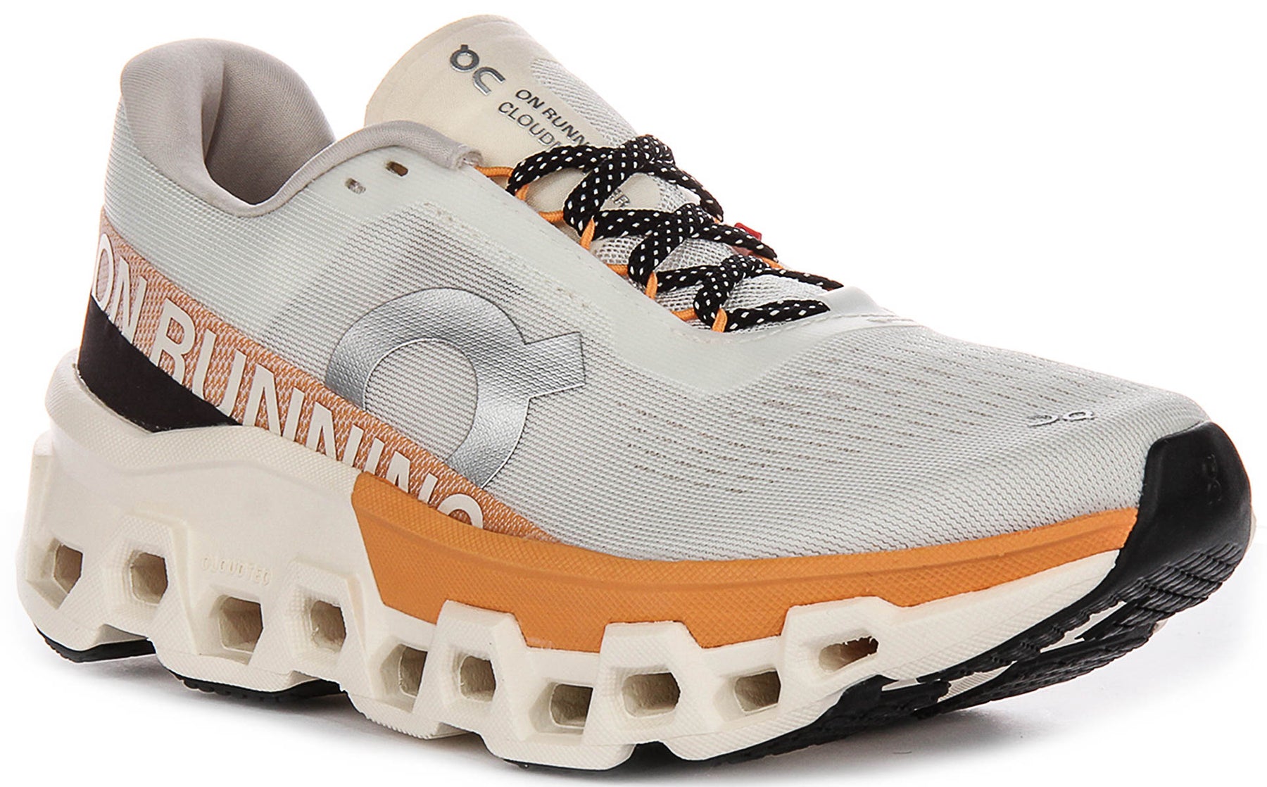 Security and comfort are paramount, delivered through a reliable lacing system featuring speckled black and white laces with subtle orange flecks, threading through reinforced eyelets for a secure fit. The padded tongue, branded with the On Running logo and 'Cloudmonster' text, minimises pressure across the top of the foot. The heel collar and interior are thoughtfully padded, ensuring a snug and comfortable fit around the ankle, preventing any irritation during extended wear.