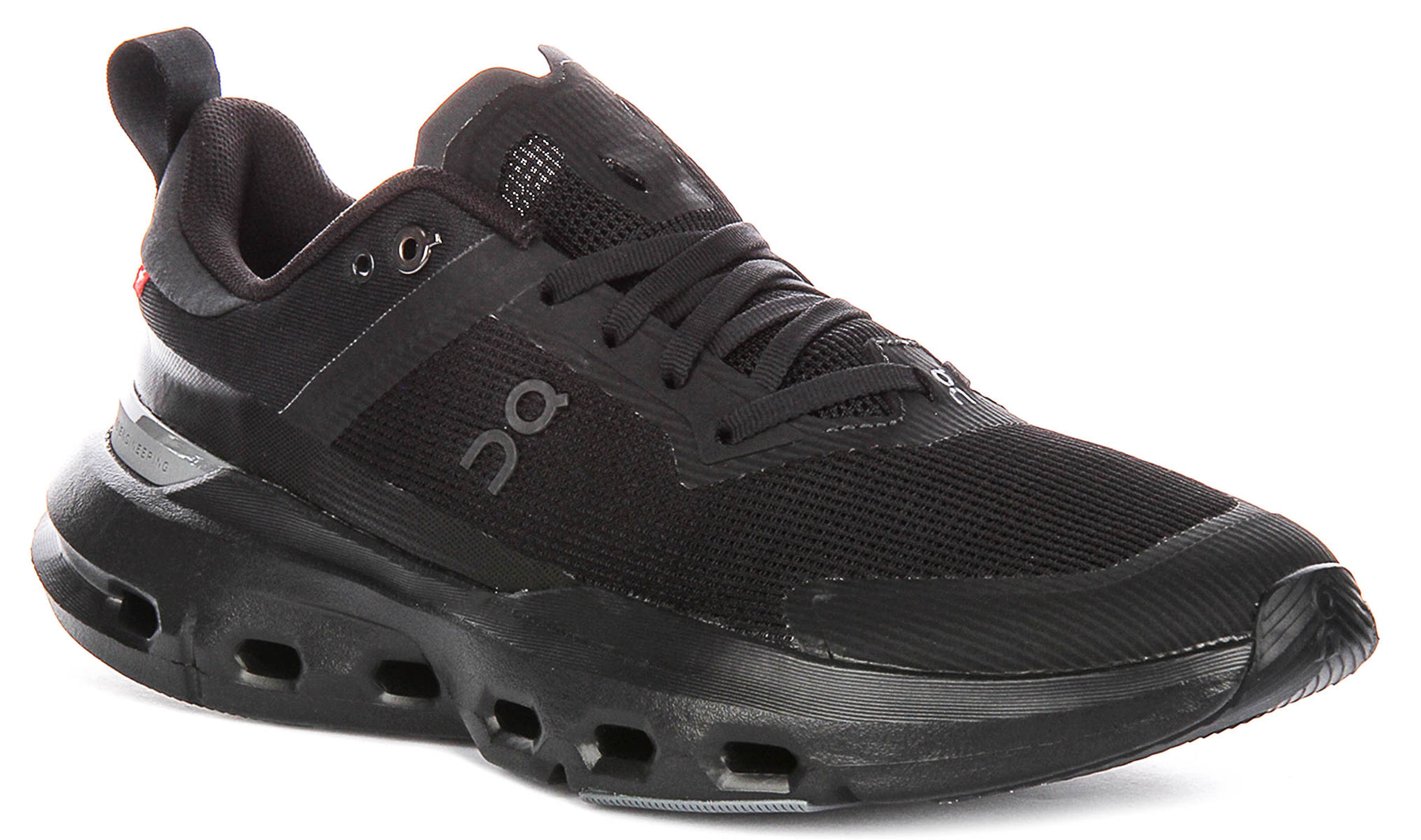 Underfoot, the durable outsole is segmented with strategically placed grey grip patterns, providing reliable traction on a variety of surfaces. The outsole also proudly features the On Running logo and "SWISS ENGINEERING" text, underscoring the shoe's robust construction and thoughtful design. These On Running Cloudpulse Next Mens Trainers seamlessly blend cutting-edge technology with a contemporary, all-black aesthetic, making them an essential addition to any active man's wardrobe.