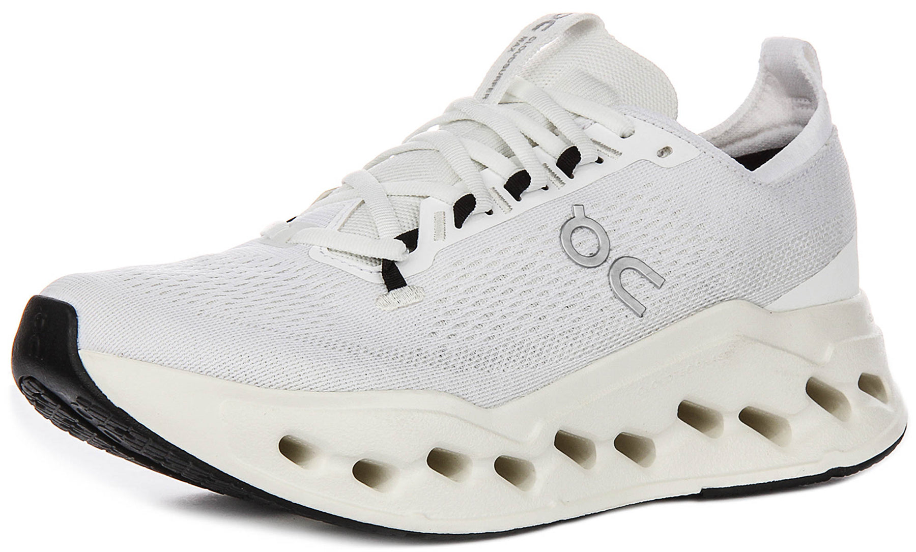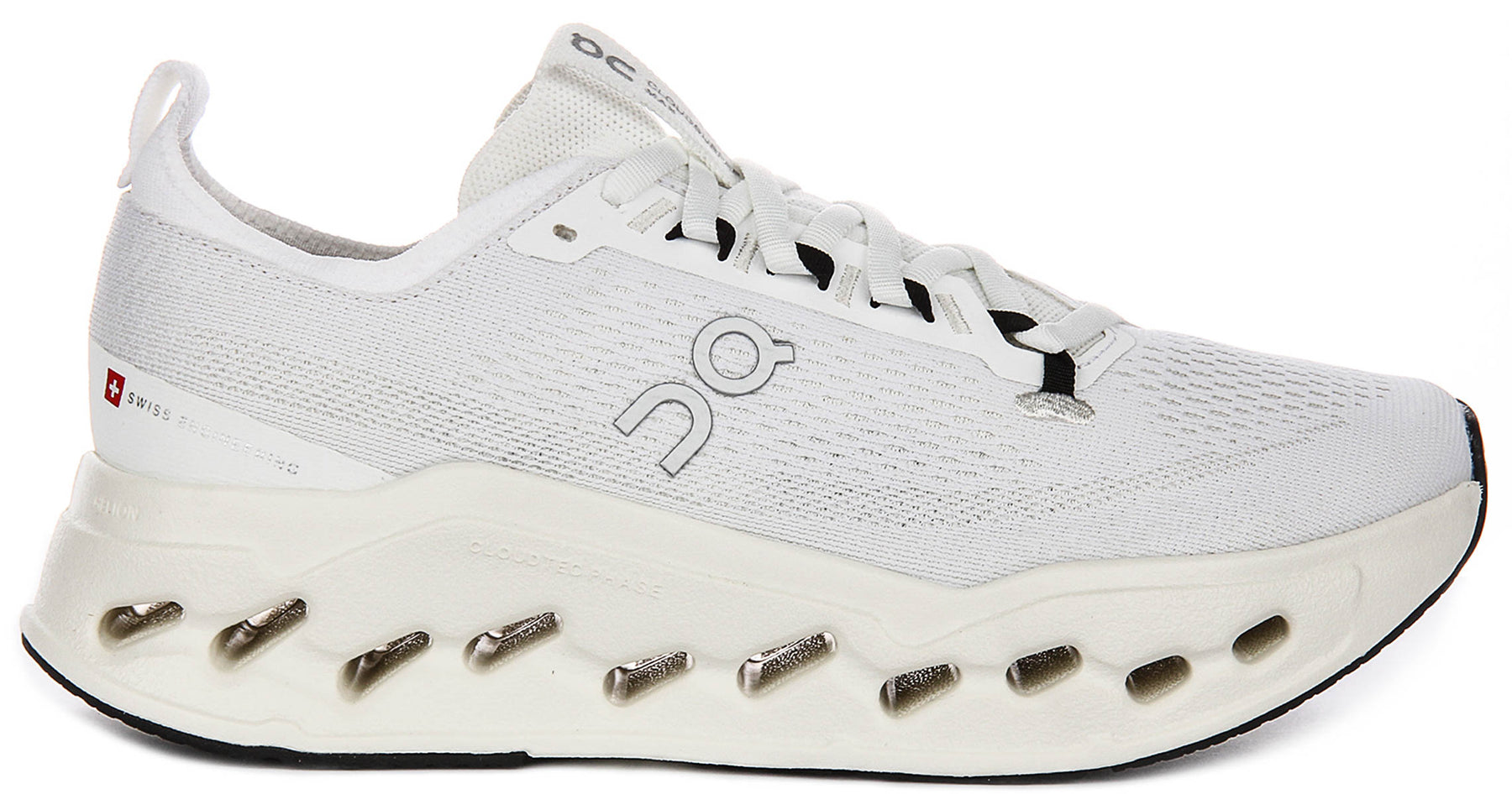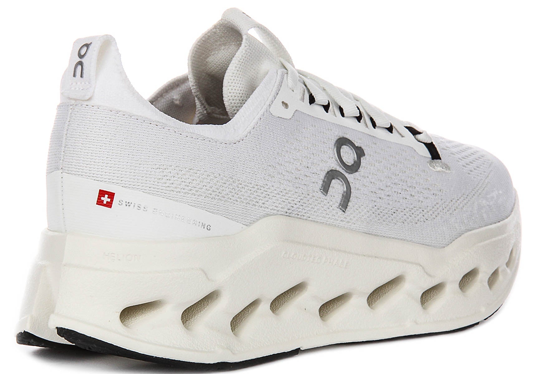 Introducing the On Running Cloudsurfer Max Womens Trainers, a premium footwear option designed for unparalleled comfort and performance. These stylish trainers are specifically tailored for women, presenting a clean and versatile aesthetic in a predominantly white colourway, making them an ideal choice for both athletic pursuits and contemporary casual wear.