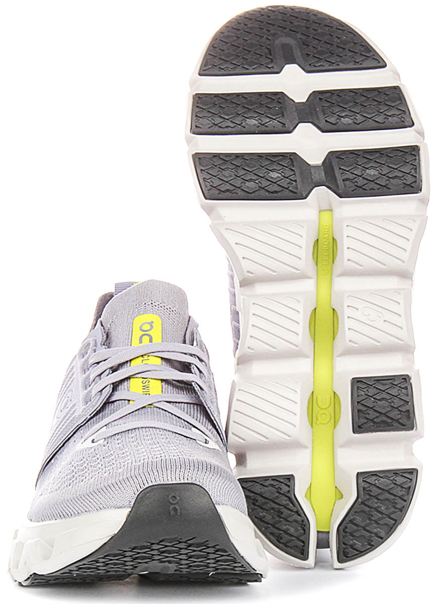 Introducing the On Running Cloudswift 4 women's trainers, expertly crafted to elevate your daily runs and casual wear. These stylish and high-performance trainers from the renowned Swiss brand On Running feature a sophisticated light grey main colour, complemented by striking neon yellow and clean white accents that add a contemporary edge to their athletic design.