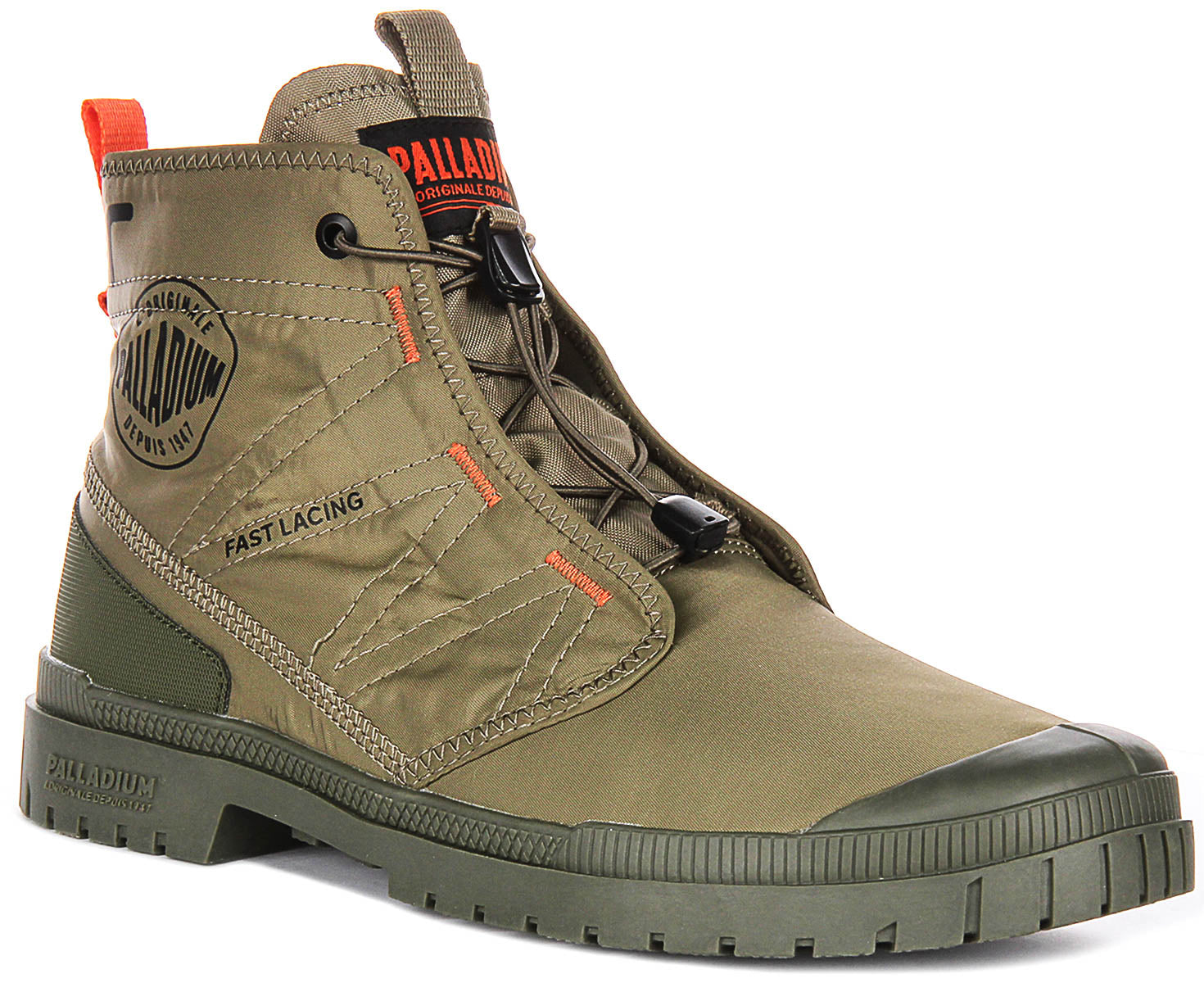 Presented in a stylish olive green shade with subtle orange accents, these boots boast a contemporary yet timeless look that can easily be paired with a wide range of outfits. The rugged, moulded rubber sole offers excellent grip and stability, making them perfect for both city streets and off-the-beaten-path adventures. Additional details such as the Palladium branding on the side and tongue, as well as the practical pull tab at the heel, add a touch of signature flair and convenience.