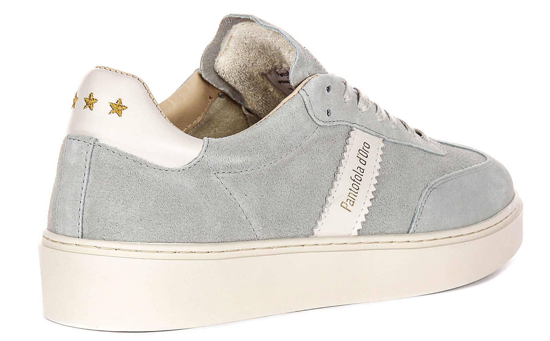 Introducing the Pantofola D’oro Argentario Men’s Suede Leather Trainers, a sophisticated blend of Italian craftsmanship and contemporary design. These trainers are crafted from premium suede leather, offering a soft, velvety finish that speaks to their superior quality. The light grey suede upper is elegantly contrasted with off-white leather accents, including the distinctive heel tab and branded side stripe, adding a touch of refined style to any outfit.