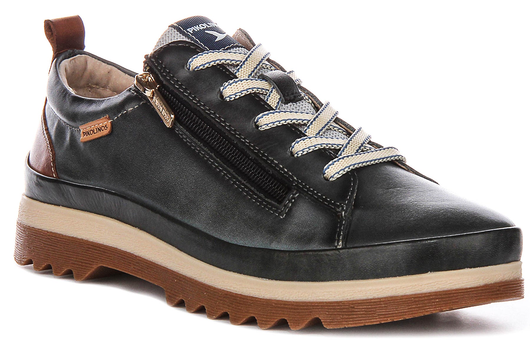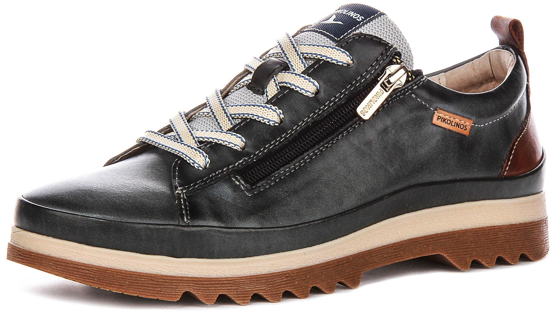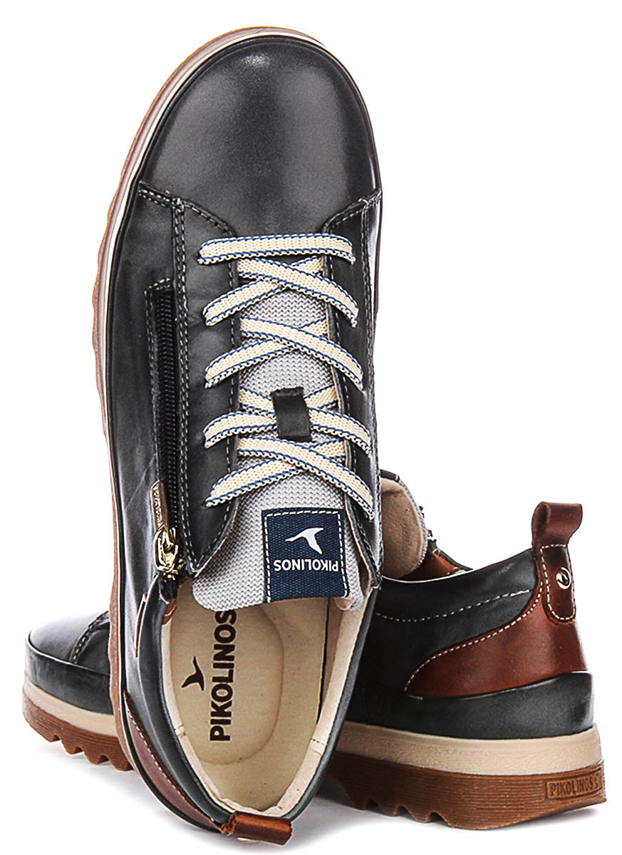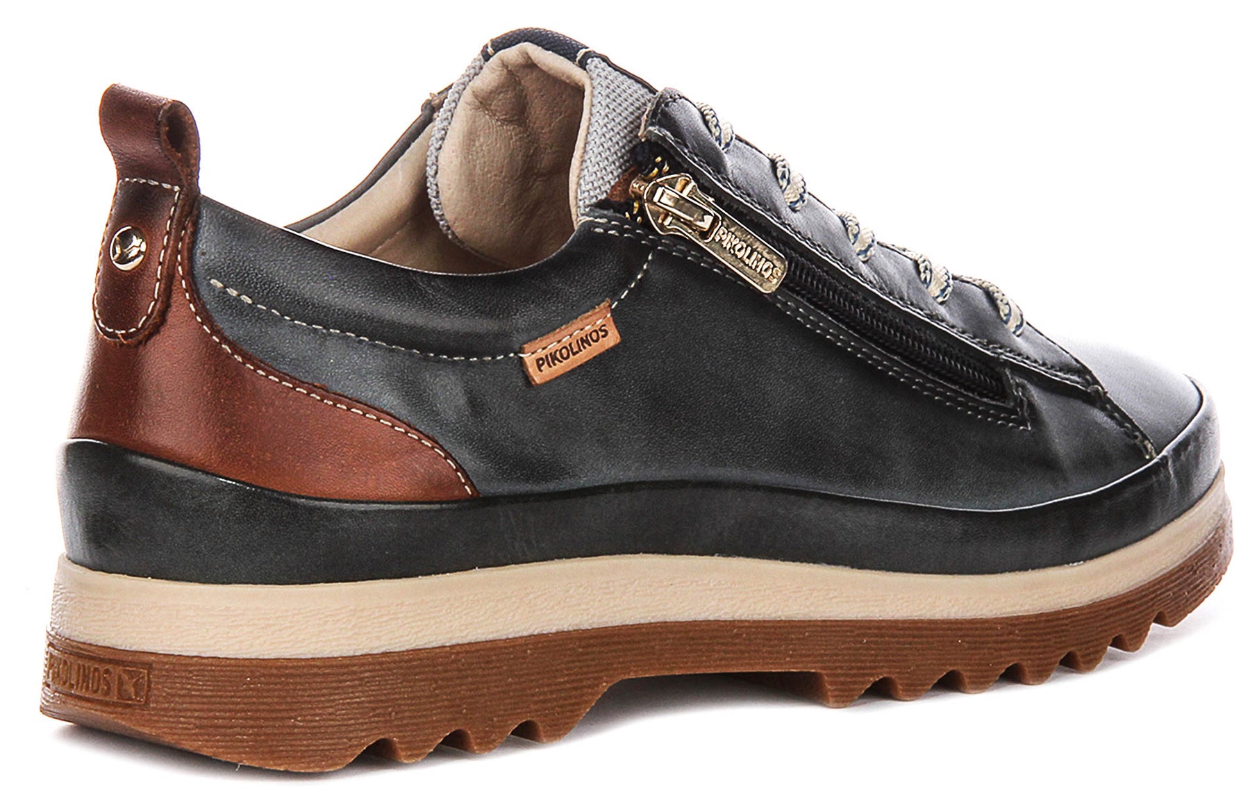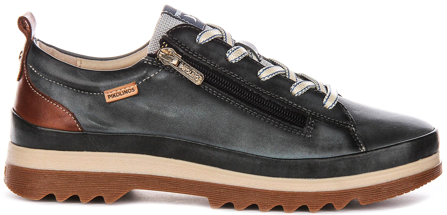 The upper features a rich, dark charcoal leather with a subtle burnished finish, providing a distinctive and versatile look. Designed for convenience, the Vigo trainers incorporate a traditional lace-up front with striking cream and navy patterned laces, complemented by a functional gold-tone side zip, elegantly branded with Pikolinos, allowing for effortless on and off. A small Pikolinos tag subtly adorns the outer side, showcasing the brand's attention to detail.