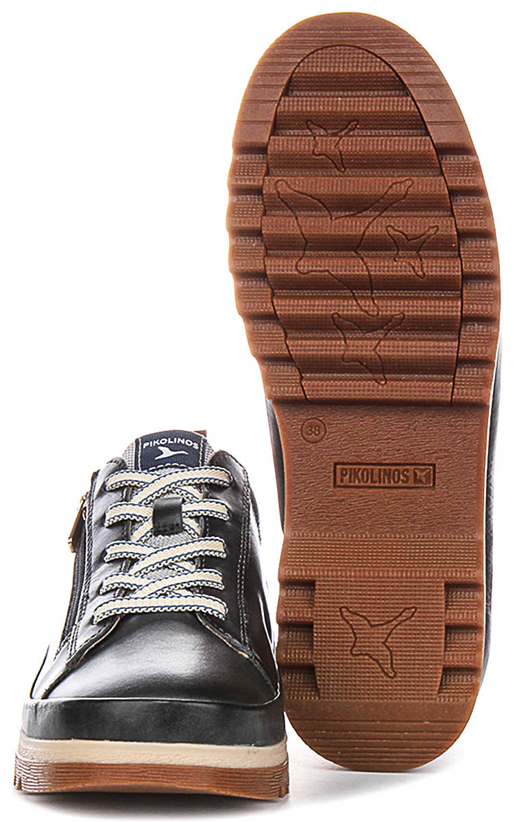 These trainers are built upon a contemporary platform sole, designed for both style and support. The multi-layered sole unit features a dark section directly beneath the upper, followed by a lighter cream or beige midsole, all resting on a robust, ridged brown rubber outsole. This chunky outsole not only provides excellent grip and stability across various surfaces but also contributes to the trainers' fashionable silhouette, embodying both comfort and a distinctly modern aesthetic. The outsole is also debossed with the Pikolinos brand, affirming its quality.