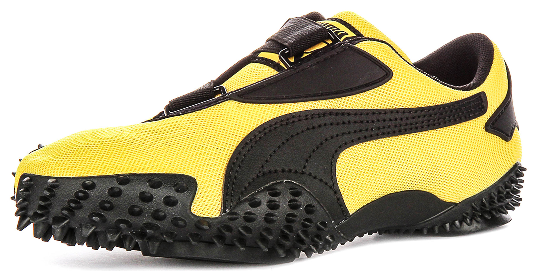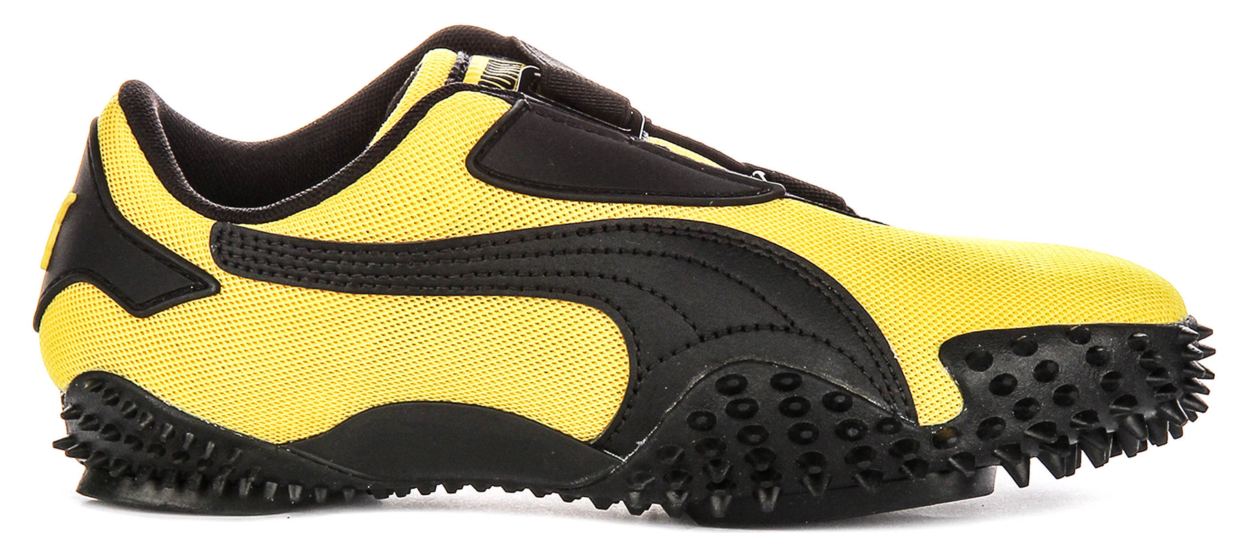 The Mostro Og Prime's most unmistakable feature is its incredibly distinct black rubber outsole. This sole boasts a uniquely studded and textured design, with prominent, soft spikes extending around the perimeter and across key areas, providing exceptional grip and a truly aggressive, futuristic aesthetic. This highly tactile sole gives the trainer a robust and confident presence, complemented by subtle Puma branding on the heel in contrasting yellow.