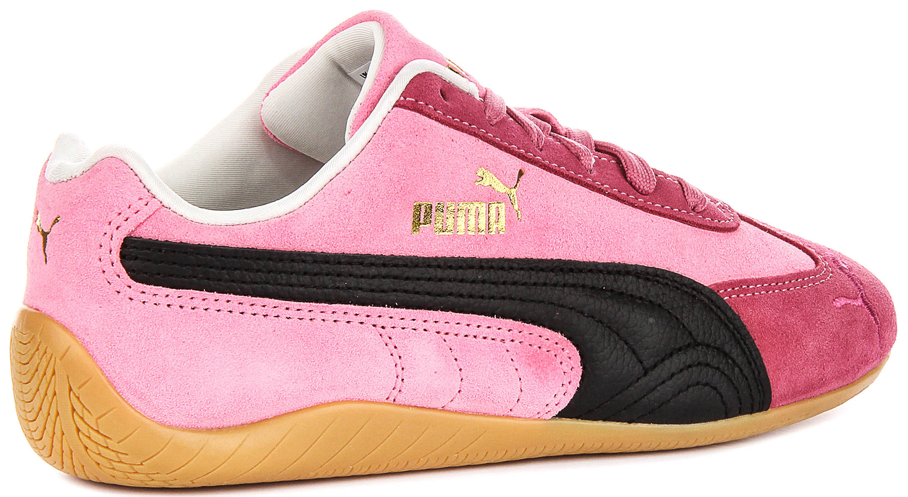 These eye-catching trainers feature a delightful two-tone pink suede upper. The main body of the shoe is a vibrant light pink, beautifully contrasted by deeper magenta hues on the toe cap and around the lace-up vamp. A bold black Puma Formstrip sweeps across the side, providing a striking visual break, while metallic gold Puma branding, including the iconic jumping cat logo and wordmark, adds a touch of luxury to the lateral side and tongue.