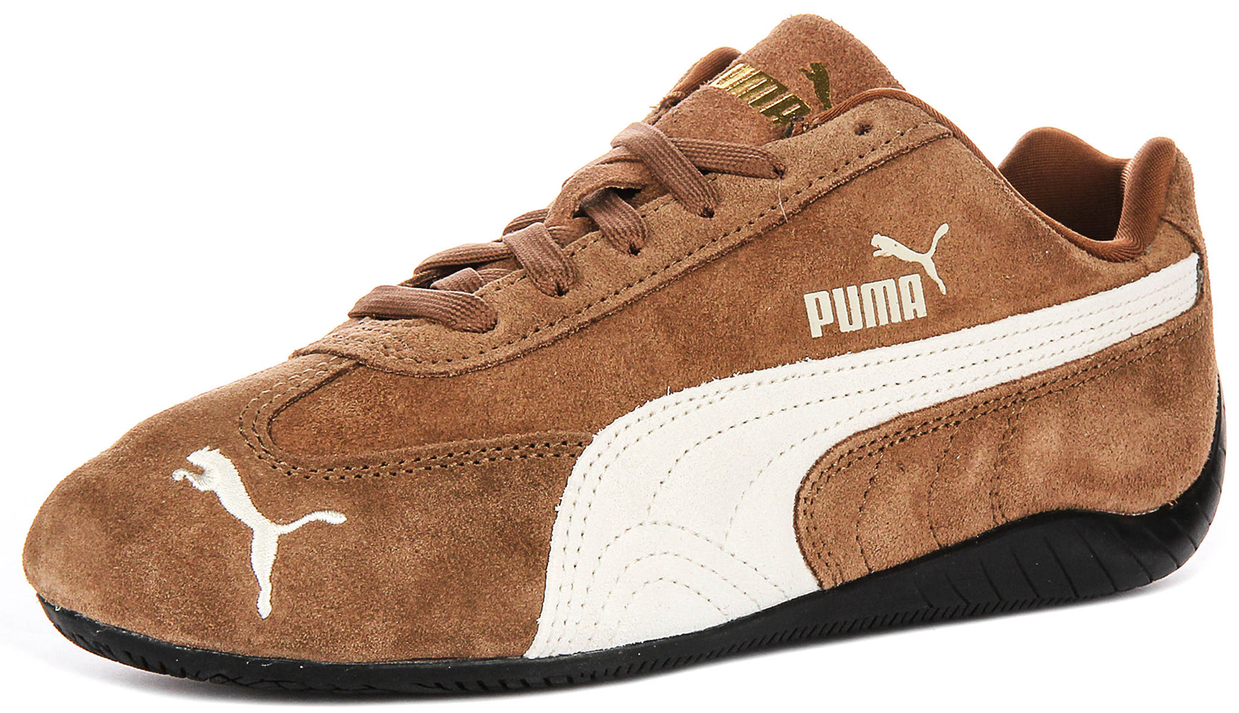 Crafted from premium suede leather, the Speedcat Og stands out with its luxurious texture and durability. The soft brown upper is complemented by Puma’s signature white side stripe, creating a timeless colour contrast that ensures these trainers are always in fashion. The gold Puma branding on the tongue and side adds a touch of understated elegance, while the embroidered Puma logo on the toe and heel complete the iconic look.