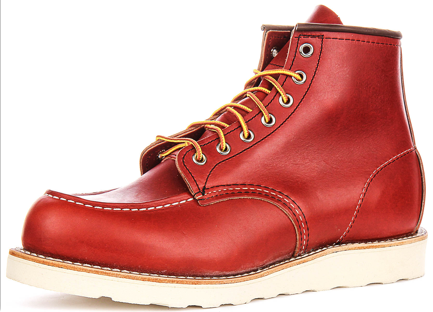These iconic boots are meticulously crafted from a high-quality, rich, deep red leather, providing a striking appearance that is sure to stand out. The premium outer material promises not only exceptional durability but also develops a unique patina over time, ensuring each pair tells its own story. The vibrant red hue is complemented by contrasting white stitching, which intricately defines the boot's panels and the characteristic moc toe construction.