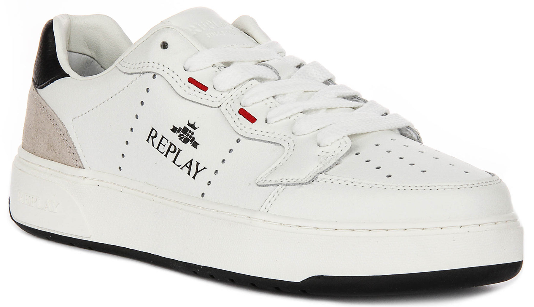 Distinctive design elements elevate the Kai Action trainers. The toe box features a classic perforated pattern for breathability and style. The side panels are adorned with subtle rows of pinhole perforations, adding texture, alongside prominent Replay branding in black lettering, crowned by the brand's iconic logo. The traditional lace-up fastening is complemented by eye-catching red loop accents near the lacing, providing a subtle pop of colour.