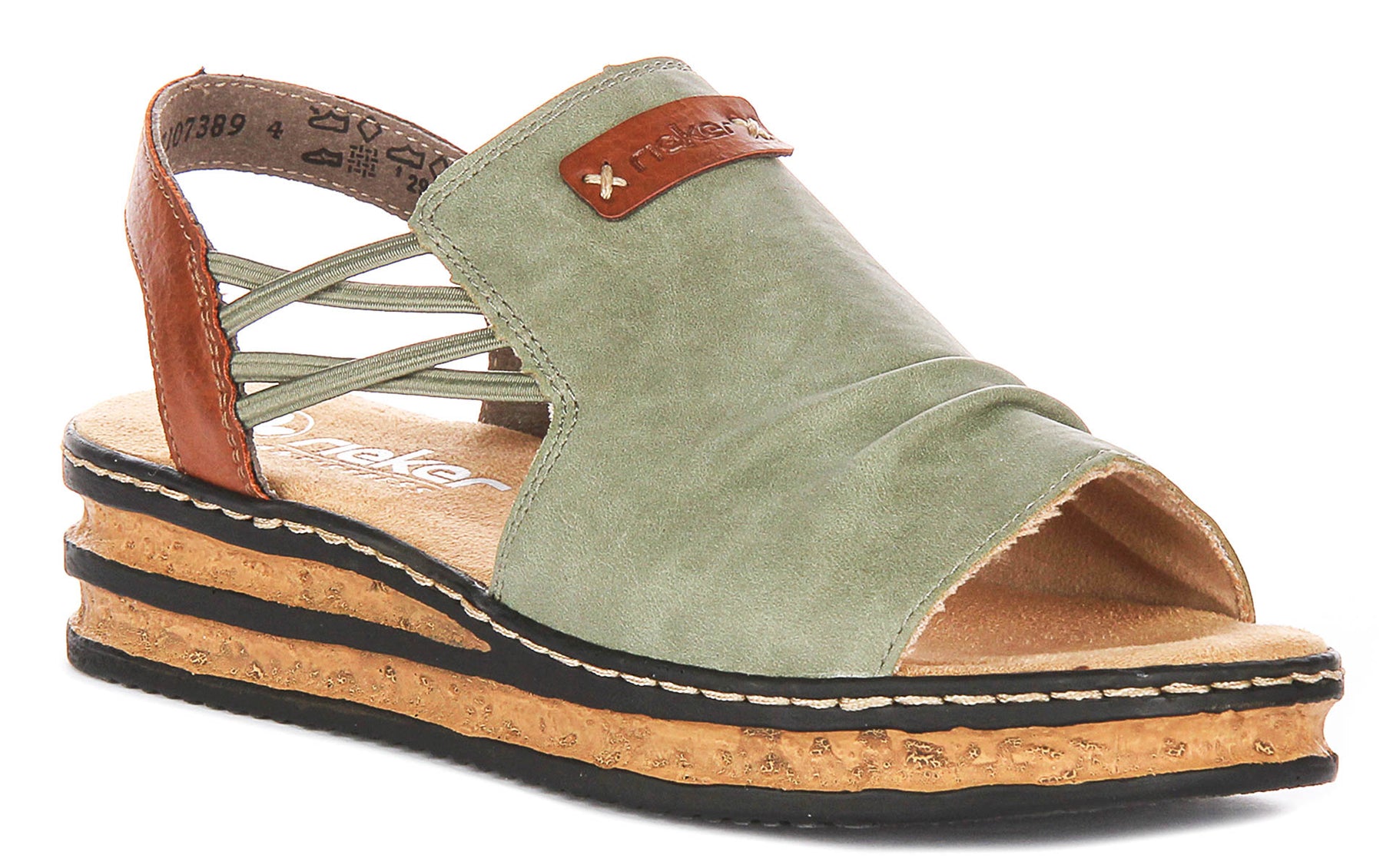 The outer material of the sandals is made from high-quality synthetic material, providing a smooth and refined look while ensuring durability. The sage green tone of the upper section exudes a natural and earthy vibe, giving these sandals a versatile appeal that pairs well with both neutral and bold wardrobe colours. A subtle pleated detail on the front adds a touch of texture and uniqueness to the design. Accented by a small, branded tab featuring the Rieker logo, these sandals subtly highlight the quality and craftsmanship synonymous with the brand.