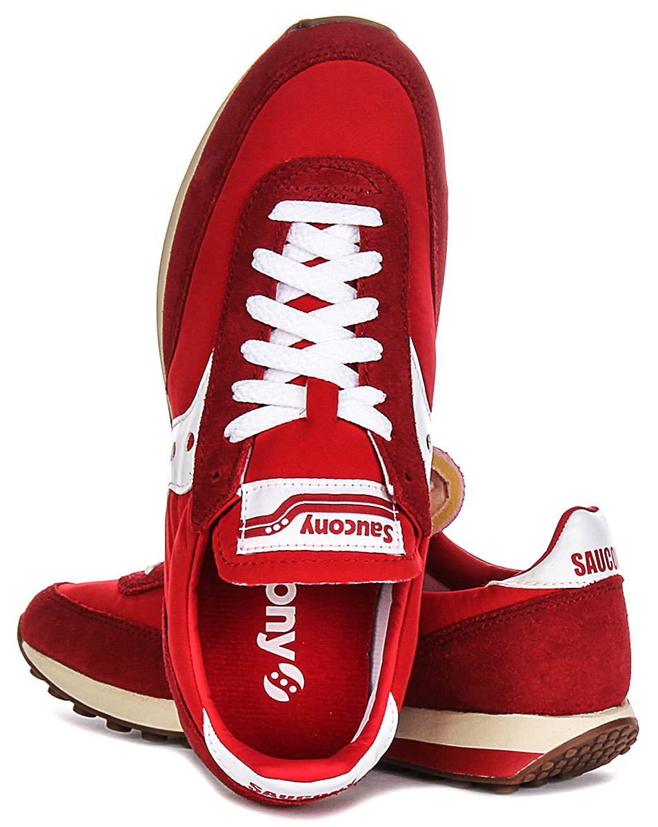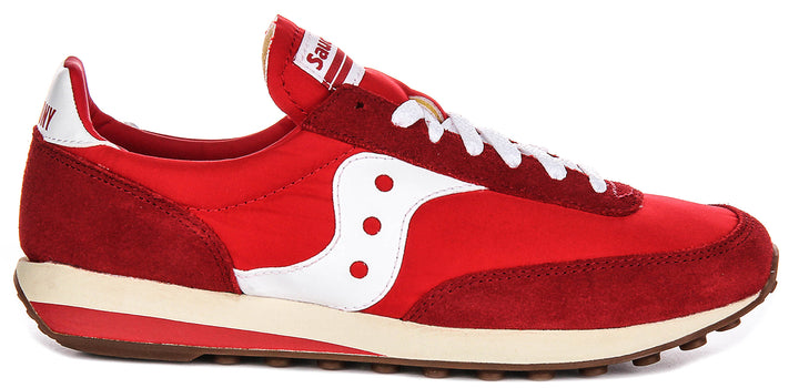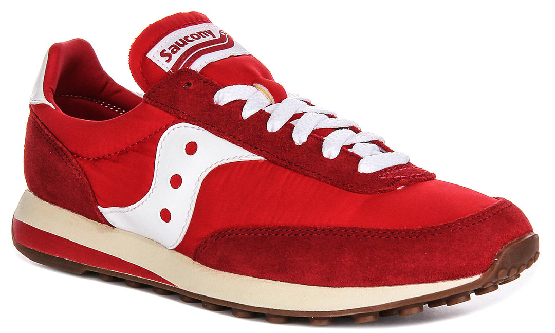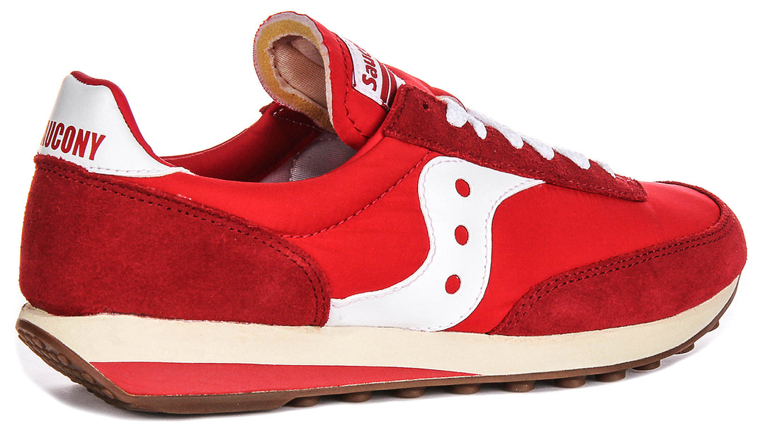 These are the Saucony Trainer 80 Canvas Suede Trainers, a stylish and versatile footwear option from the renowned brand Saucony. These trainers showcase a vibrant red colourway, making them a bold statement piece for your casual wardrobe. The upper material combines both canvas and suede, creating a visually appealing textural contrast. The suede elements appear to be in darker red and strategically placed around the toe, heel and along the sides, adding durability and a premium feel, while the canvas forms the main body, providing breathability and flexibility for comfortable wear.
