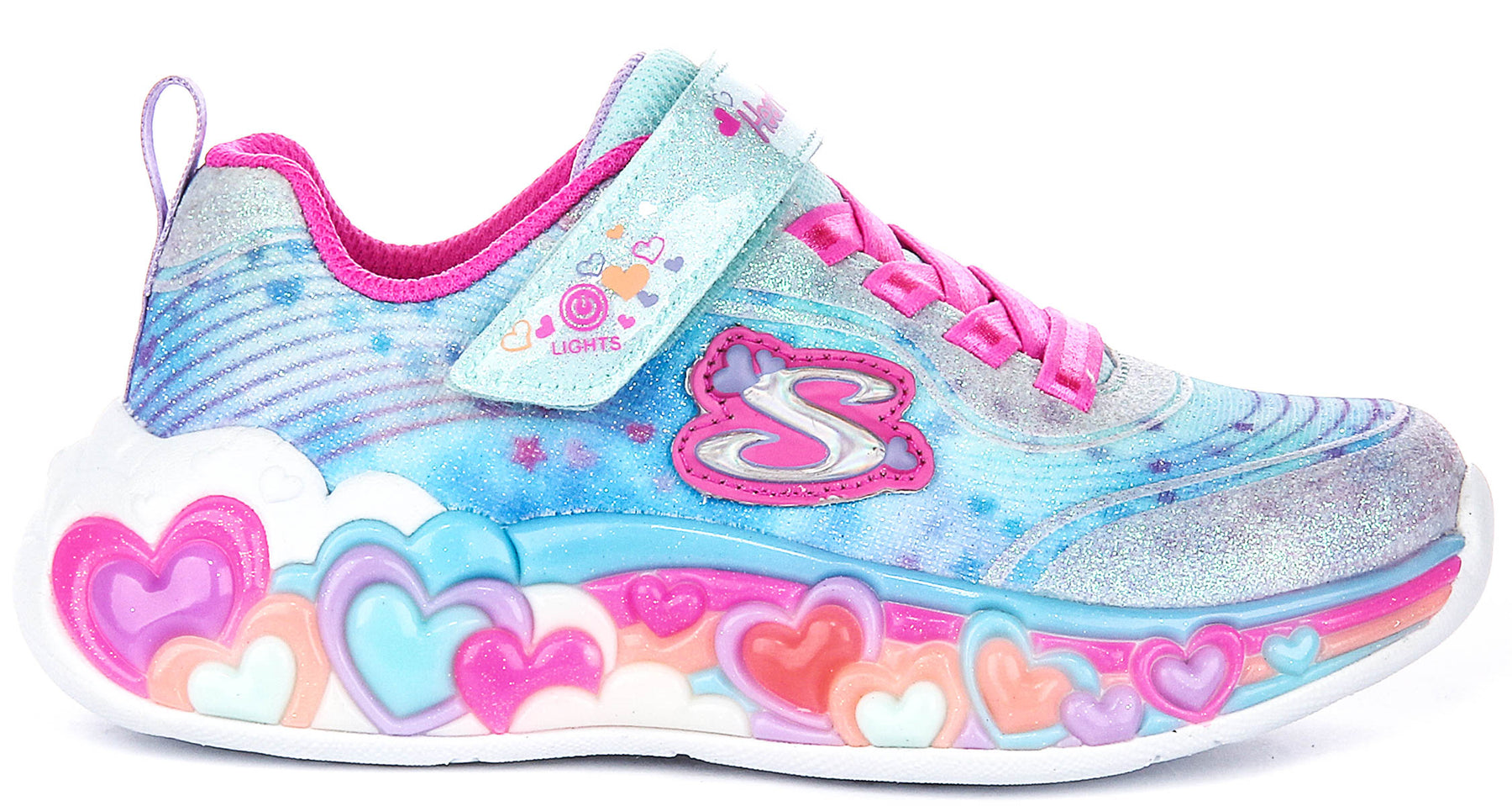 The most eye-catching element is undoubtedly the vibrant heart-themed midsole, adorned with colourful 3D hearts that not only add a cheerful aesthetic but also feature built-in lights for an extra dose of fun. Every step lights up with a gentle glow, making playtime even more magical and ensuring your child stands out in any crowd.