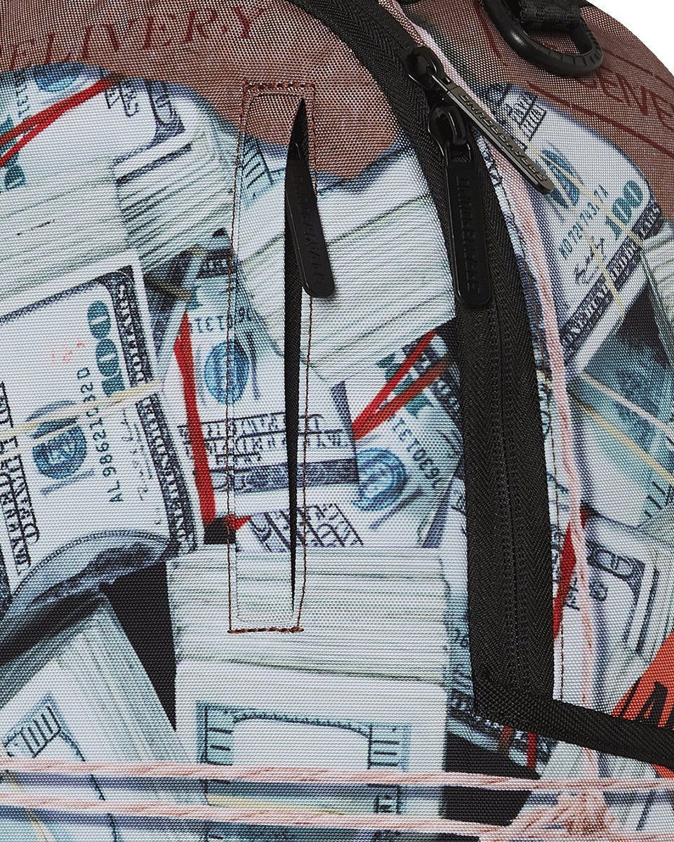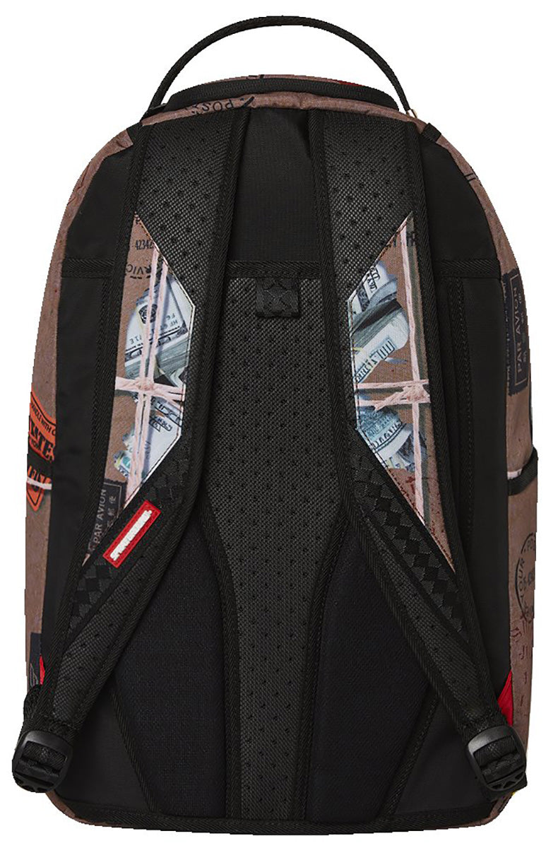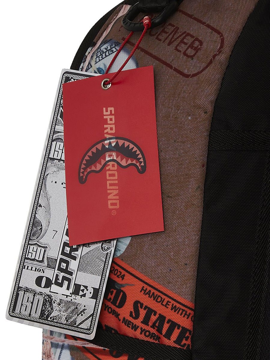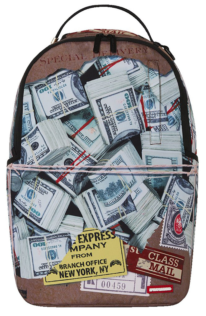 In terms of style, the expressive print showcases a creative "money stack" theme interspersed with postal motifs, giving the backpack a unique urban edge. It features subtle branding details, such as the Sprayground logo, which enhances its premium appeal. The black, brown, and green tones provide a visually striking yet cohesive look that effortlessly captures attention.