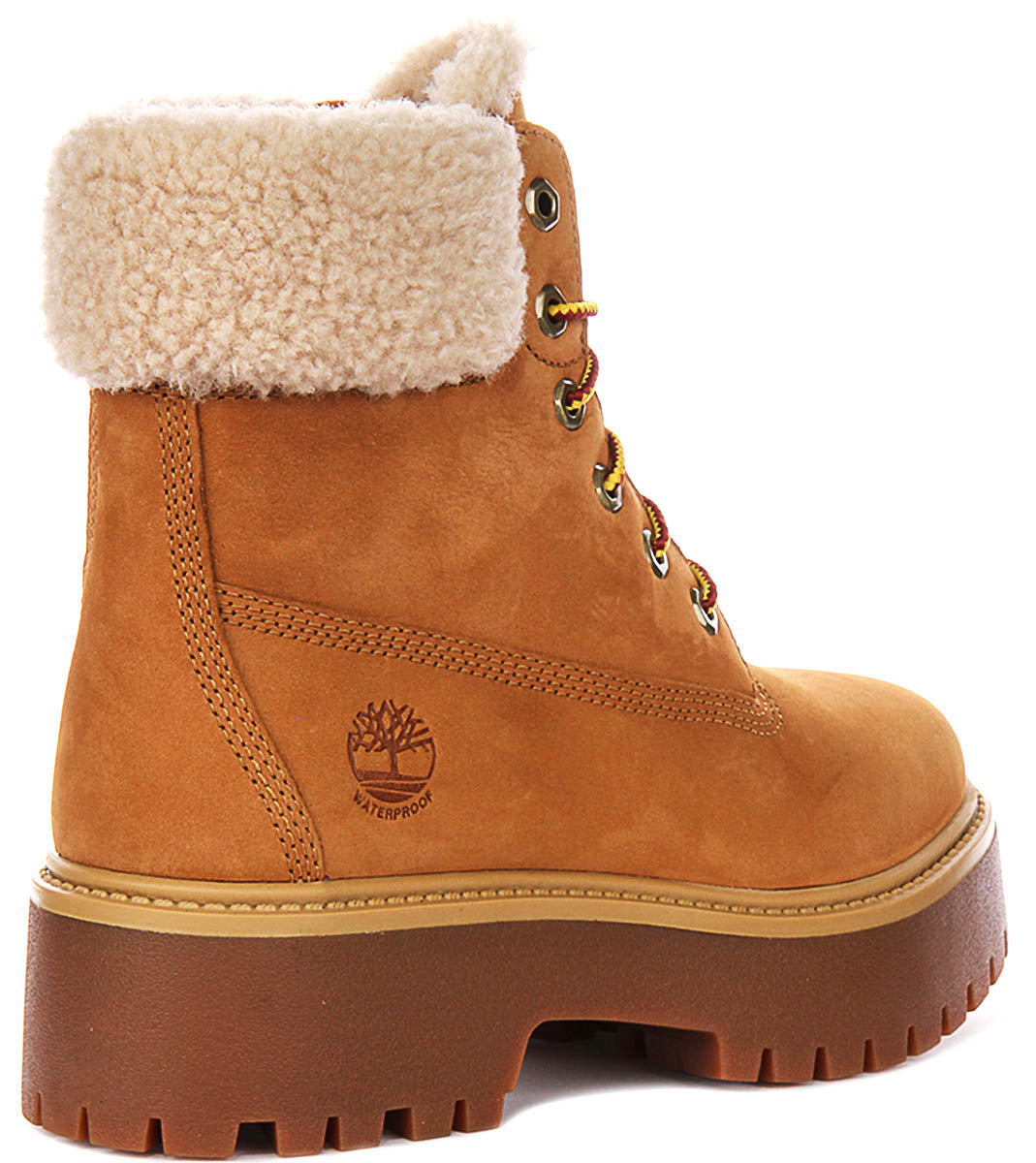 These A2PU6 boots stand proudly on a substantial and fashionable platform sole in a deeper brown hue, which provides extra height and a contemporary edge. The rugged, deeply lugged rubber outsole not only enhances the boot's chunky profile but also ensures excellent traction and grip on various surfaces. A subtle lighter tan rand frames the upper and sole, creating a neat finish. Adding to their practical appeal, the boots are clearly embossed with the iconic Timberland tree logo and the word "Waterproof" on the side, highlighting their readiness for diverse weather conditions.