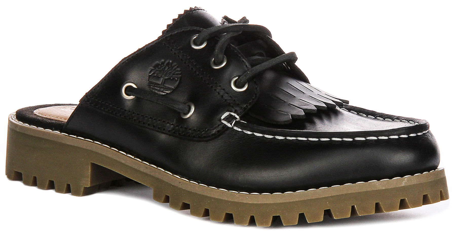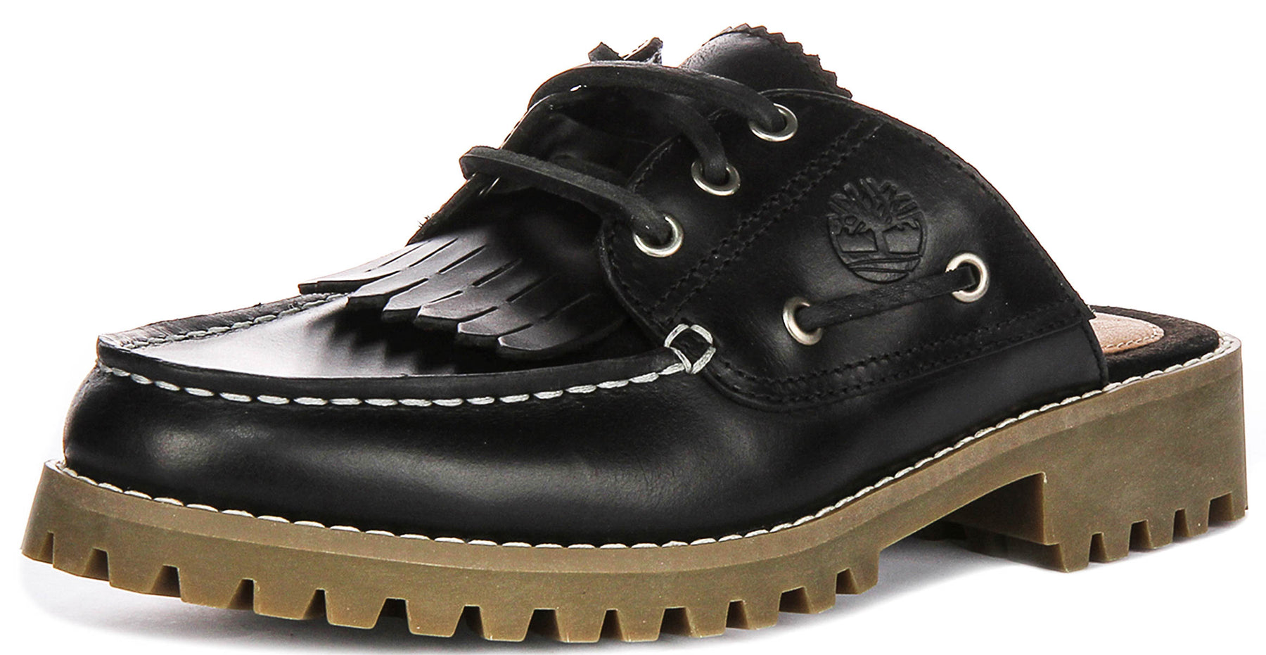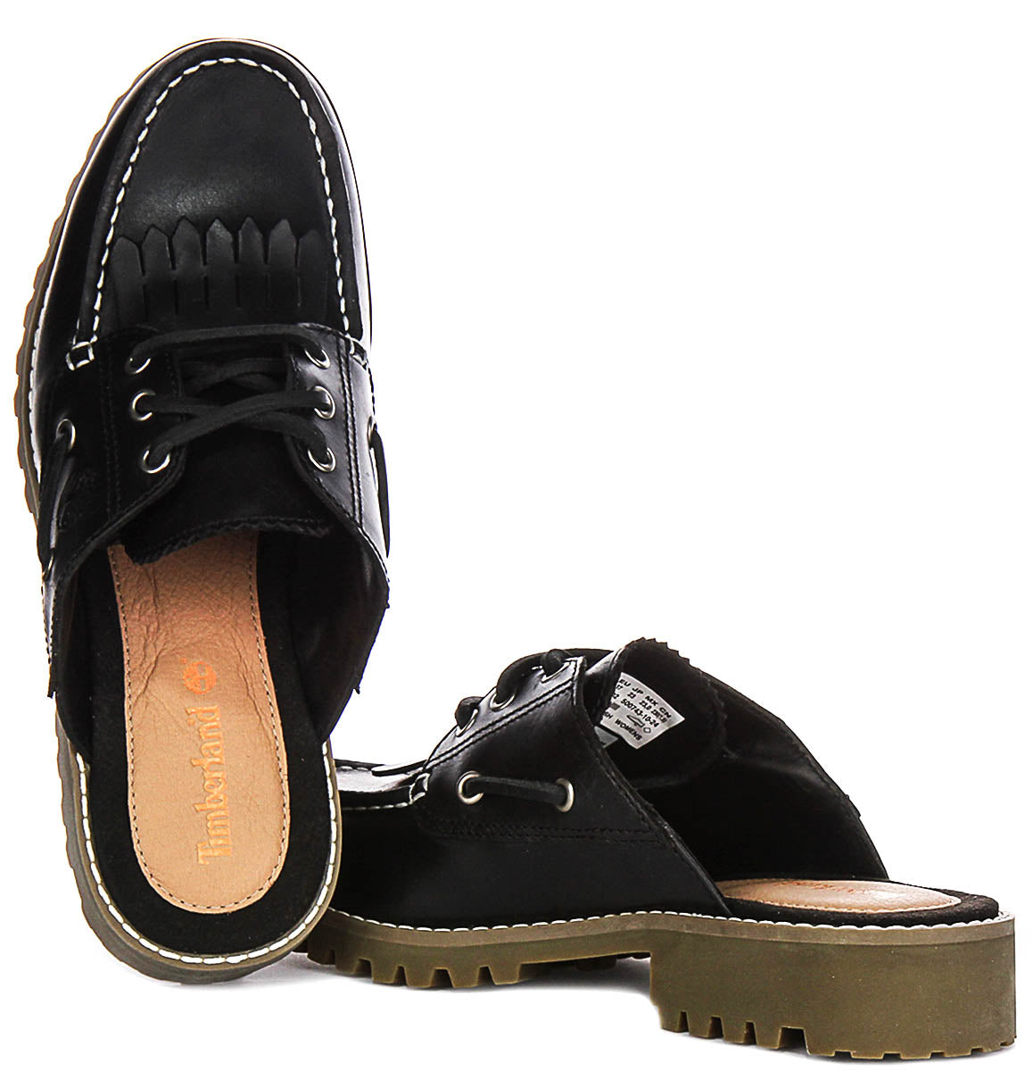 Key product details: Brand: Timberland. Product name: A4198. Product type: Shoes (slip-on mule with boat-shoe styling). Outer material: Leather. Target gender/group: Womens. Colour: Black. Style/colour code: A4198. Notable features include an embossed logo, kiltie fringe detail, hand-stitched moc-toe with contrast stitching, two-eye lacing, cushioned leather footbed and a rugged lugged rubber outsole.