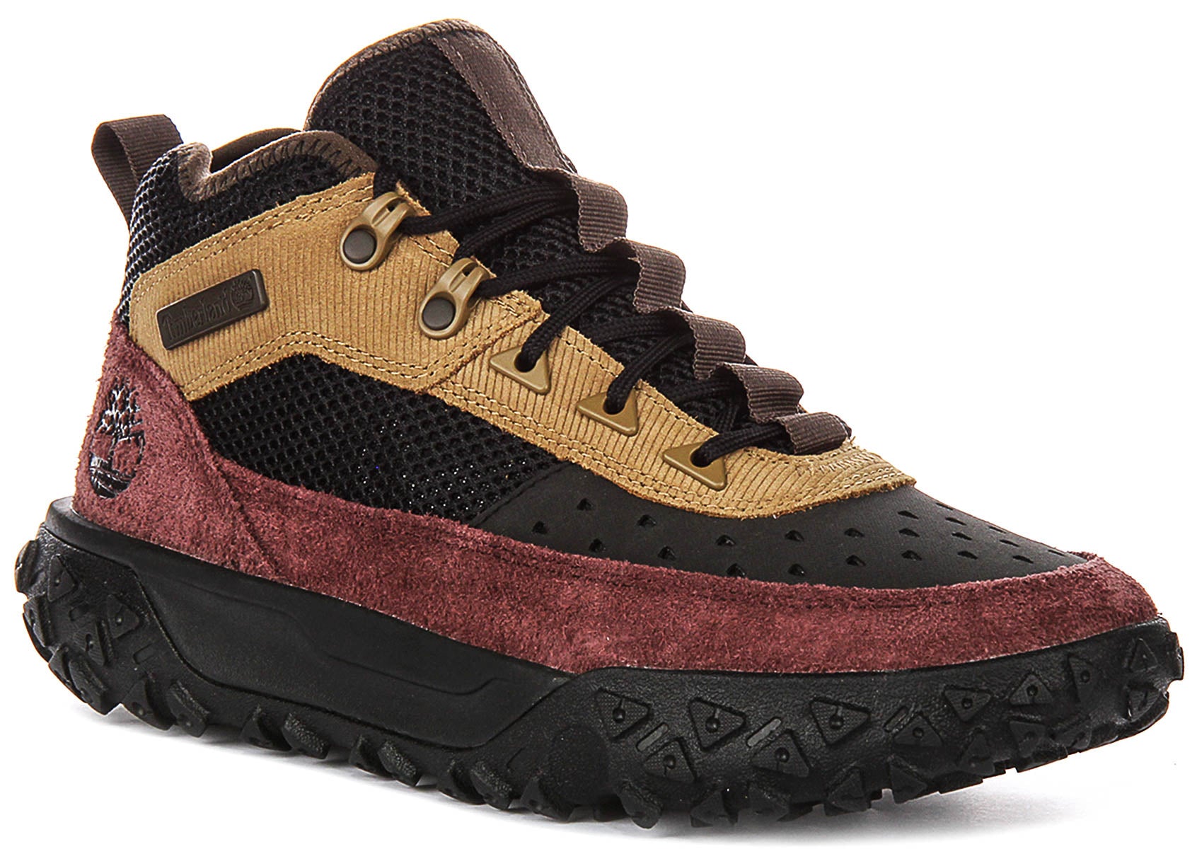 Underfoot, the Timberland A6CW1 boasts a commanding black sole unit engineered for exceptional grip and stability. The chunky outsole features a dynamic, multi-directional lug pattern with prominent triangular shapes, providing reliable traction across various terrains. The robust construction of the sole ensures durability, ready to tackle diverse environments. A subtle aqua-coloured accent is visible on the underside of the sole, adding a touch of modern flair to the functional design.