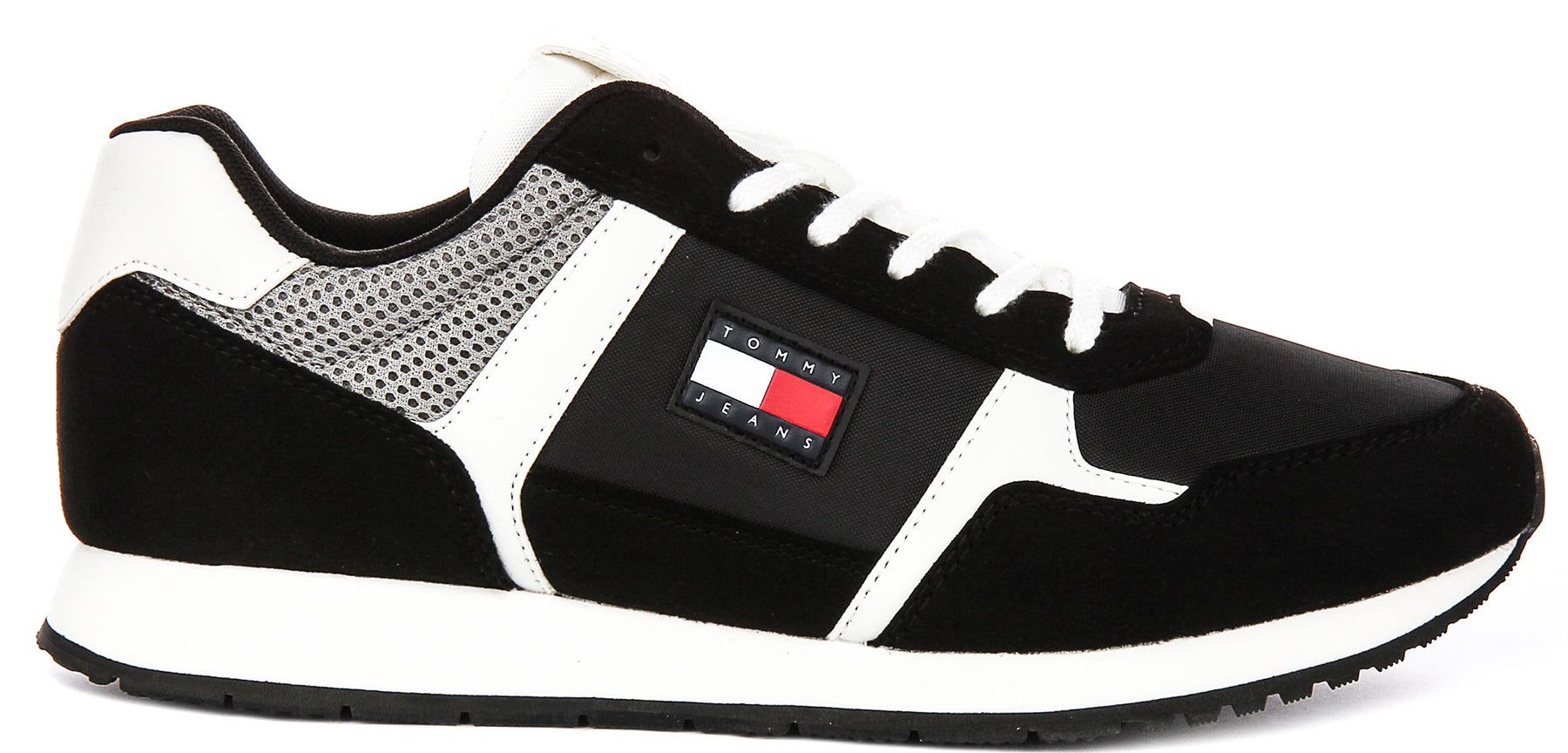 The design is accented by crisp white details that stand out against the black base. Bold white stripes sweep across the side, creating a contemporary aesthetic, while the clean white laces and cushioned tongue add to the fresh appeal. The instantly recognisable Tommy Jeans flag logo is proudly displayed on the side panel, affirming the brand's heritage and quality.