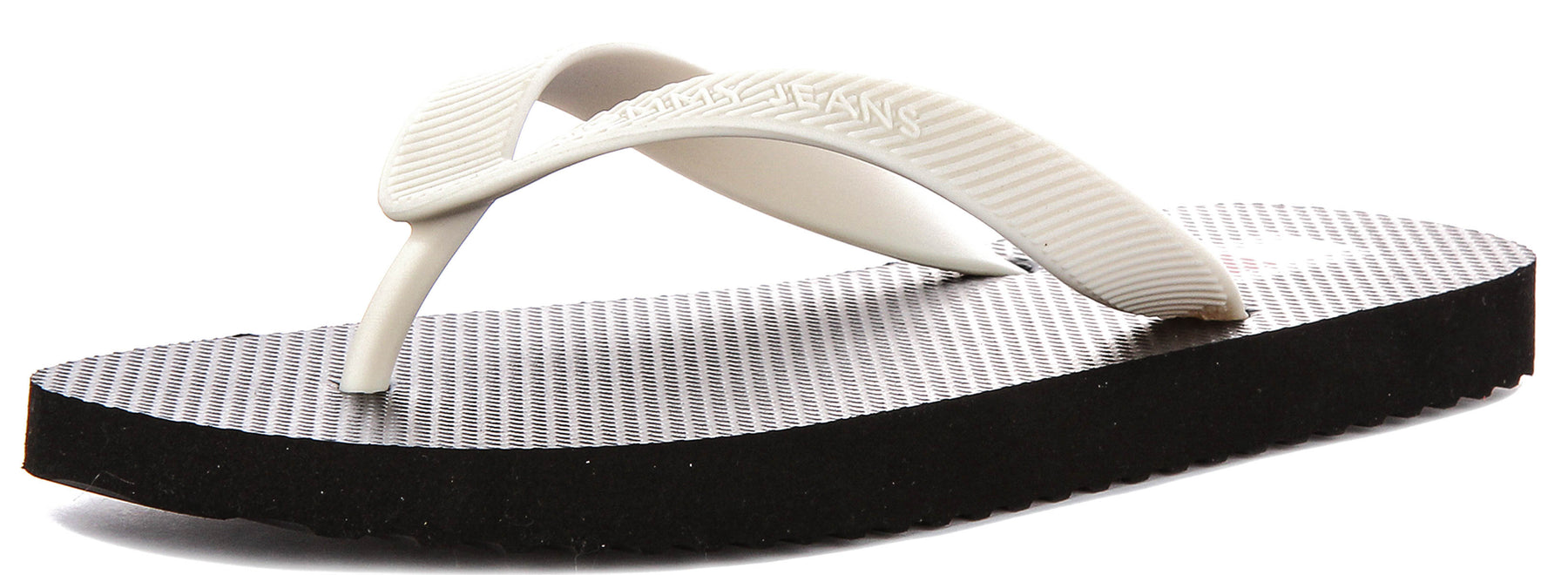 The thong strap design is ergonomically shaped to provide comfortable support between the toes whilst the curved upper portion of the strap sits comfortably against the foot. The synthetic material used in the strap construction is soft and flexible, moulding to the wearer's foot over time for personalised comfort. The ribbed texture on the strap not only enhances grip but also adds a modern, textured finish that complements the overall design language of the sandal.