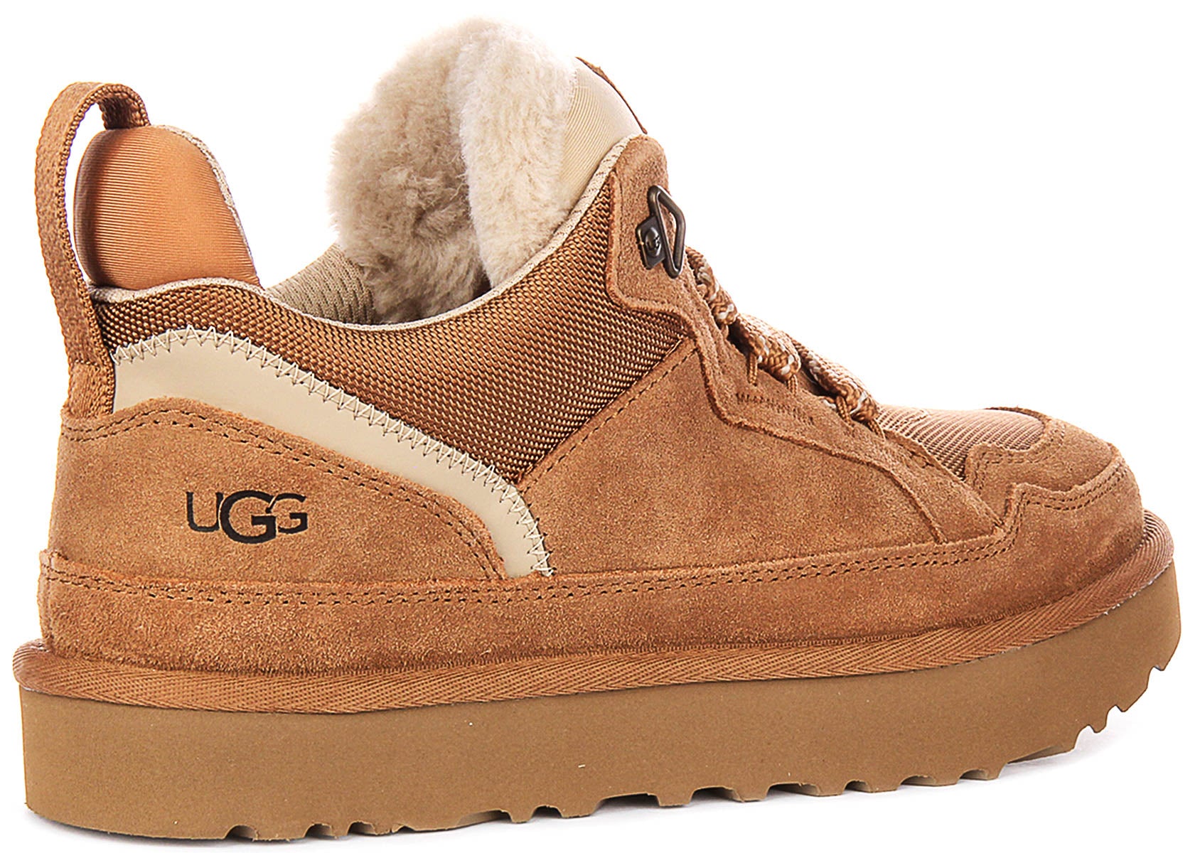 Functionality is key to the Lowmel design, evident in its sturdy construction and practical features. The trainers boast a thick, platform-style sole unit in a matching tan colour, complete with a pronounced lug pattern for superior grip and traction on various surfaces. The lacing system incorporates robust, flecked brown and white laces threaded through sturdy D-ring eyelets at the top, ensuring a secure fit. A practical pull tab at the heel assists with easy on and off, while subtle Ugg branding is tastefully embossed on the side panel and tongue, affirming the shoe's premium lineage.