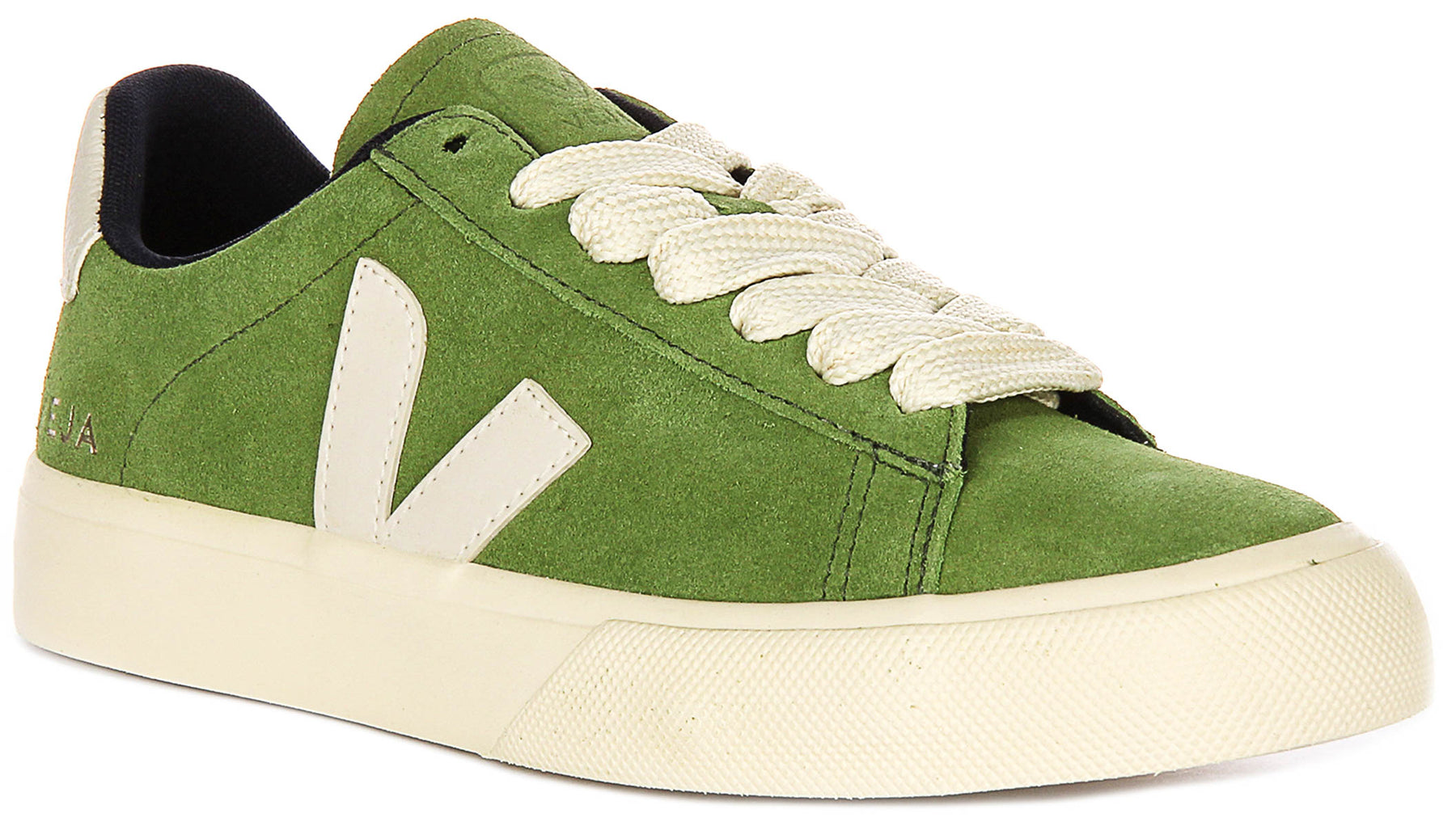 The outer material is made from premium suede leather, giving the shoes a soft yet durable texture. The bold green shade, accented by cream-coloured laces and detailing, offers a fresh and distinctive look that stands out from classic trainer designs. The signature Veja 'V' logo is prominently displayed on the side in white, enhancing the trainer’s instantly recognisable aesthetic.