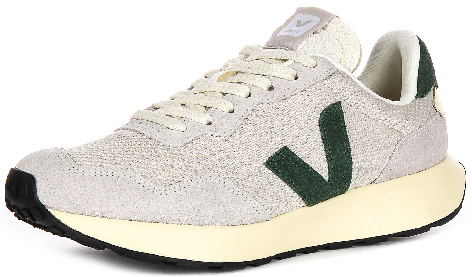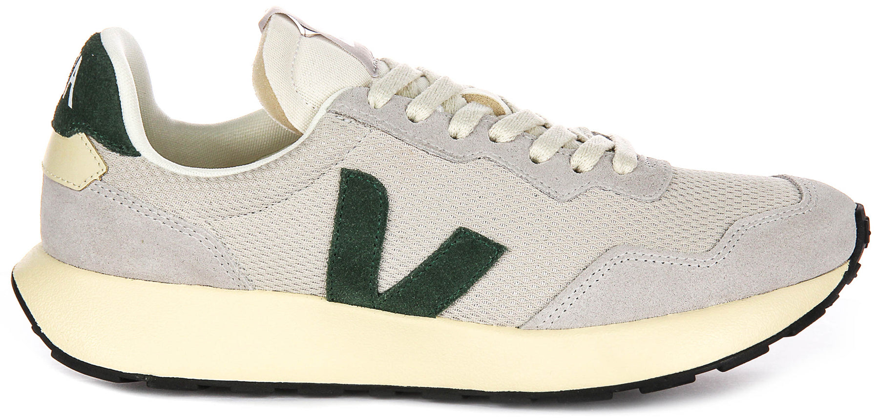 Crafted with a premium suede mesh outer material, the Paulistana trainers provide a breathable and flexible fit while exuding an elegant, textured look. The upper features a soft light beige base, contrasted by signature dark green Veja branding on the side and heel tab, adding a distinctive yet understated touch to your outfit.