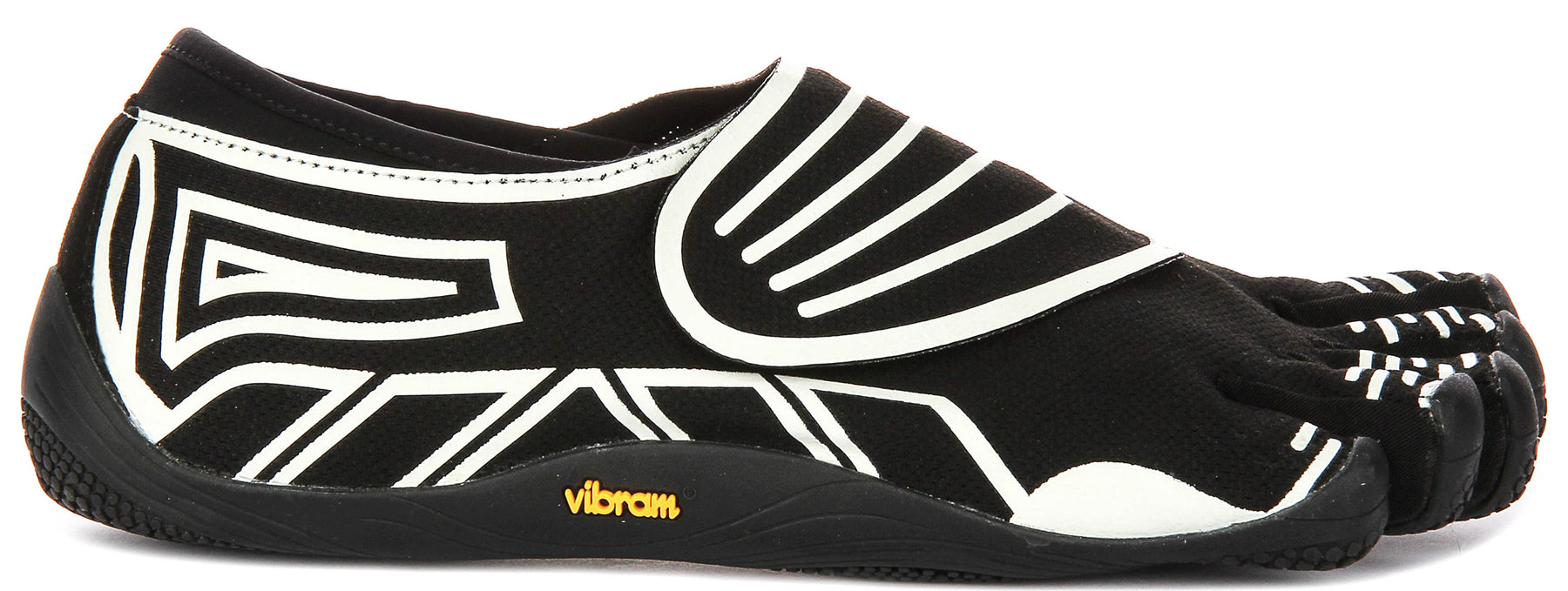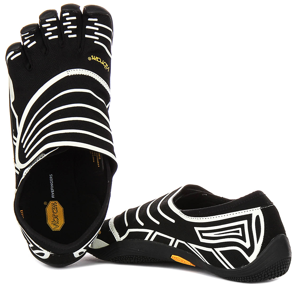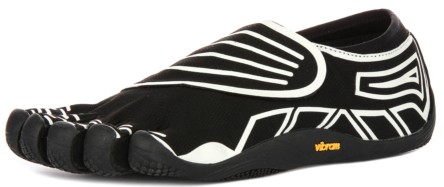 The Groundsplay model boasts a sleek black synthetic upper, dramatically contrasted with bold white graphic patterns that wrap around the sides and over the midfoot. This eye-catching abstract design gives the shoes a modern, dynamic aesthetic. True to the brand's signature style, each shoe features individual toe compartments, allowing for enhanced dexterity and balance, whilst contributing to the unique visual appeal.