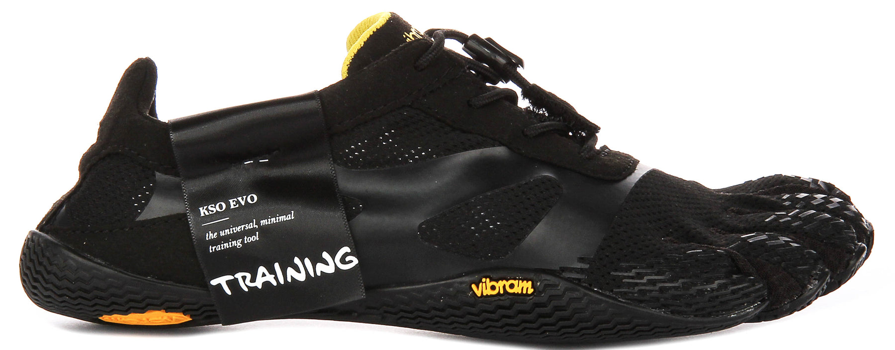 These Kso Evo trainers are presented in a sleek all-black colourway, ensuring a versatile and stylish appearance that complements any athletic wardrobe. The outer material is a high-performance synthetic, featuring a breathable mesh upper that promotes optimal airflow, keeping your feet cool and comfortable even during the most demanding workouts. Durable synthetic overlays enhance the structure and support, while subtle touches of yellow and orange branding, including the iconic Vibram logo, add a distinctive visual accent.