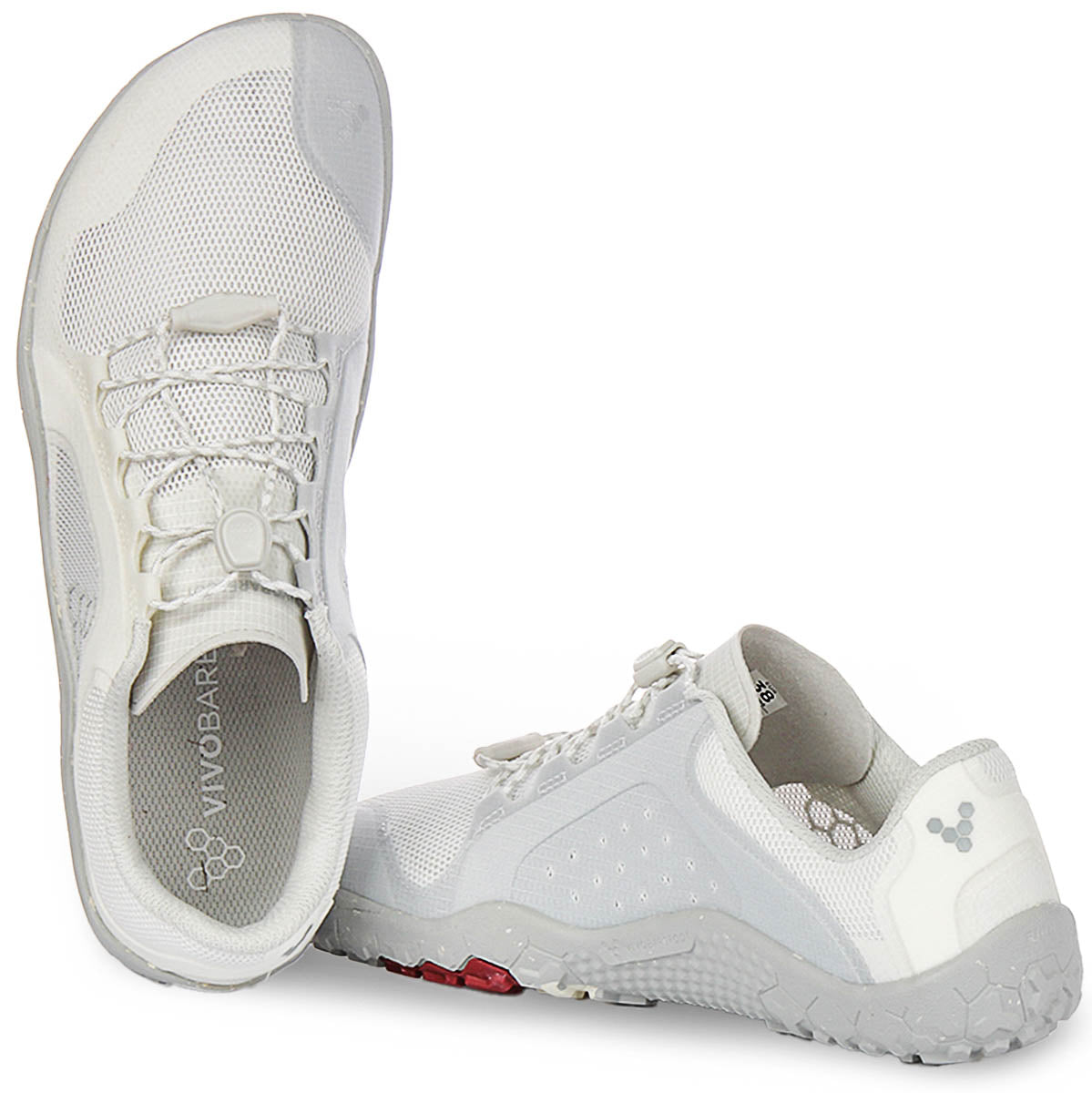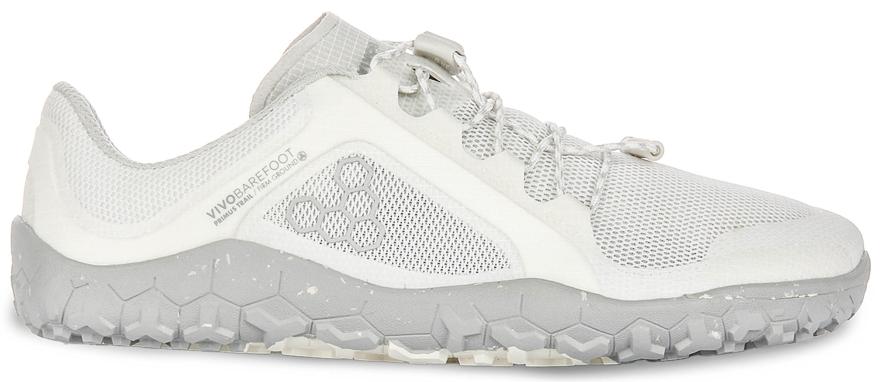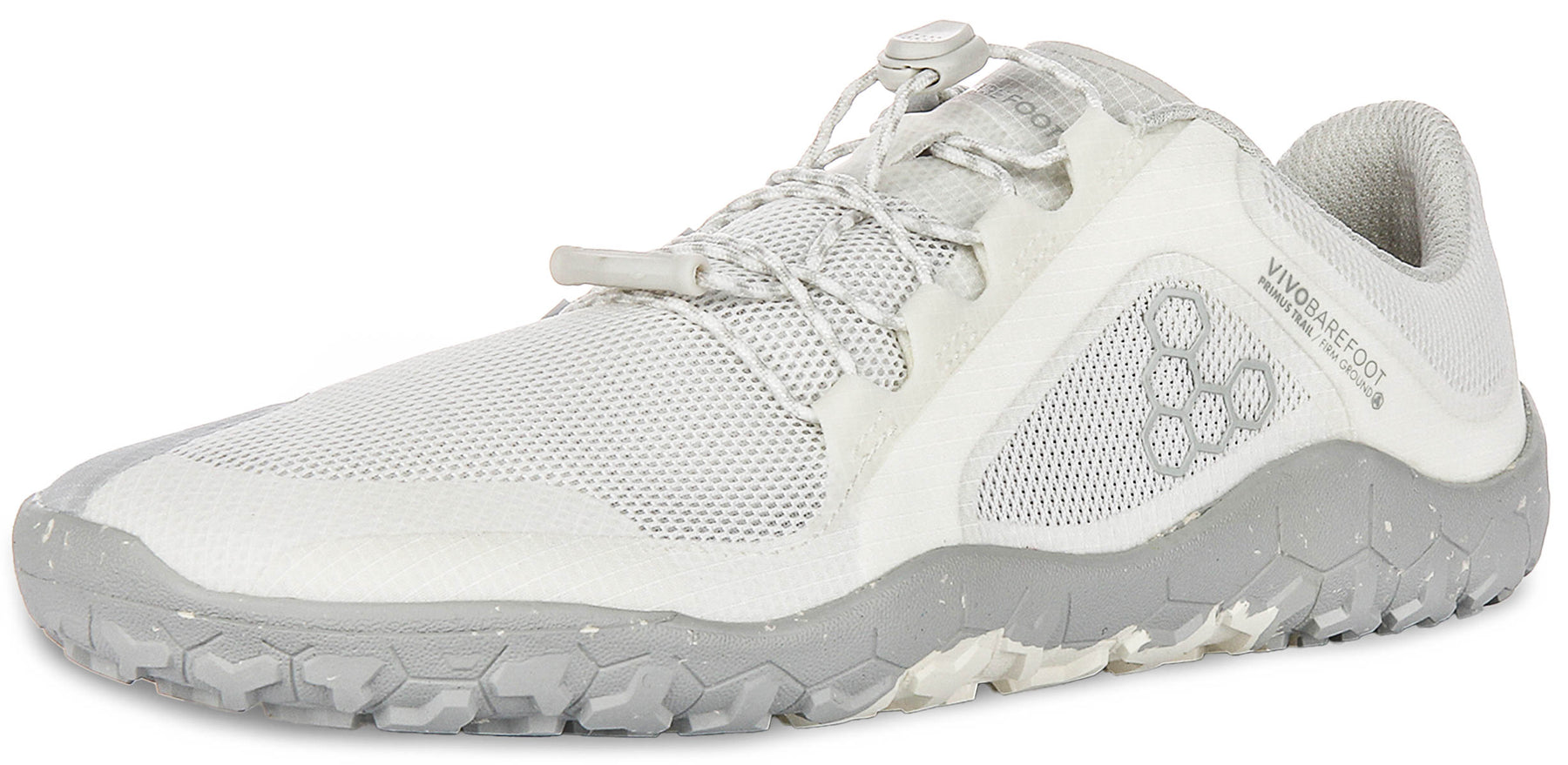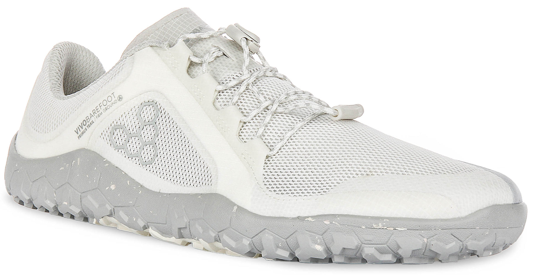 Step into natural movement with the Vivobarefoot Primus Trail Fg Womens Mesh Trainers. These innovative trainers are expertly designed for women who seek to reconnect with the ground, offering a lightweight and flexible experience ideal for a range of outdoor adventures, from trail running to country walks. The overall colour scheme is a versatile light grey, almost off-white, with a distinctive speckled light grey sole, providing a modern and earthy aesthetic.